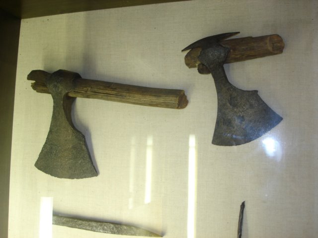 В отношении топоров можно назвать две формы, проникшие на Русь с Севера и Северо- Запада. К первым относятся образцы «с выемкой и опущенным лезвием», с прямой верхней гранью и боковыми выступами-мысками только с нижней стороны обуха. Наибольшее скопление этих топоров (различающихся на боевые и рабочие) наблюдается среди финских памятников Северо- Востока; в XI в. эти образцы широко прослеживаются на всем севере Руси, включая Новгородские земли. В Норвегии, Швеции и Финляндии упомянутые формы появились еще в VII-VIII вв.