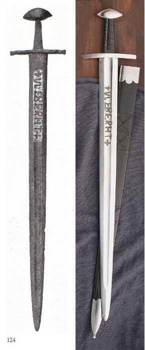 Мечи являлись единственным раннесредневековым оружием, удостоившимся подписного клейма. Большими латинскими буквами капитального шрифта на лезвиях были написаны имена не самих мечей или их владельцев, а именно мастеров или мастерских. Из числа изученных, у 25 мечей (45%) обнаружены имена западноевропейских каролингских оружейников, работавших, вероятно, в районах Рейна и Дуная. Перечислю их: ULFBERHT (встретилось 16 раз), INGELRII ME FECIT (встретилось два раза), буквосочетание, близкое предыдущей марке, начинающееся с NRED .(встретилось один раз) LEUTLRIT, CEROLT, ULEN (по одному разу). Некоторые из приведенных имен или редки, или встречены впервые. Мы получили возможность судить о работе древних мечедельцев, узнав их продукцию. Наиболее крупной была мастерская ULFBERHT1`а. До сего дня в европейских коллекциях зарегистрировано не менее 120 мечей с этой, очевидно, семейной маркой. Можно себе представить, в каких количествах расходились эти лезвия в древности. В производстве клинков существовала, видимо, значительная концентрация рабочих сил и технических достижений, далеко опережающих свое время. Несмотря на торговые запреты, франкские клинки проникали к скандинавам и славянам и, в том числе, русским.