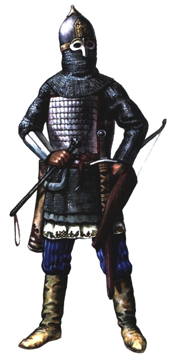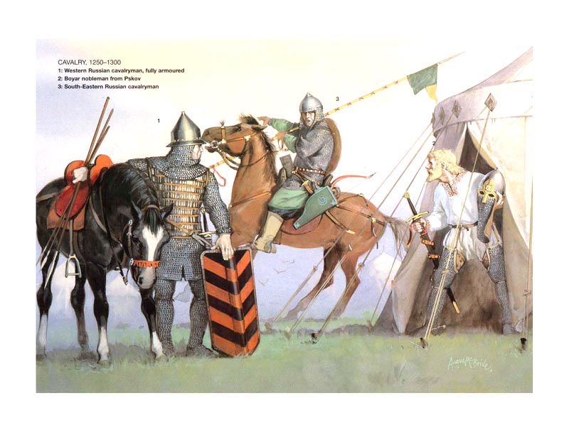 Русский витязь 13 века облачался в кольчугу, поверх которой надевалась чешуя или кожаный панцирь с железными пластинами. Голову воина защищал конический шлем, имевший наносье или маску. В целом, ”армор класс” дружинников не только был для своего времени весьма солидным, но и превосходил таковой у европейских рыцарей. Богатырский конь, правда, несколько уступал размерами европейскому дестриэ, но разница между ними была несущественна.