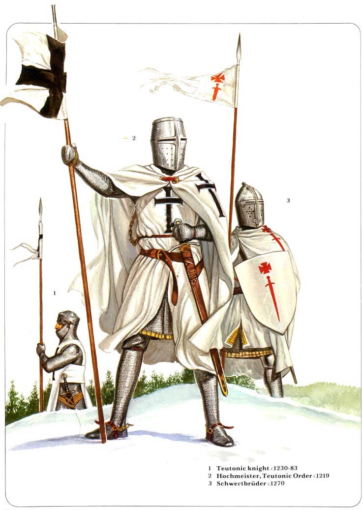 Если на Руси они появились в виде купцов, приезжавших за живым товаром («девкы купити»), то по латышско-эстонской Прибалтике они шли тяжелыми железными когортами, побеждая племенные ополчения, сжигая села и прикрывая грабительское завоевание лицемерным лозунгом крещения язычников. Неуклонное победоносное движение рыцарей в течение пяти столетий привело их от берегов Эльбы к границам русских княжеств. Позади были покоренные и наполовину истребленные племена, а впереди – богатейшие русские города с их многочисленными торжищами, дворцами князей и несметными сокровищами кафедральных соборов.