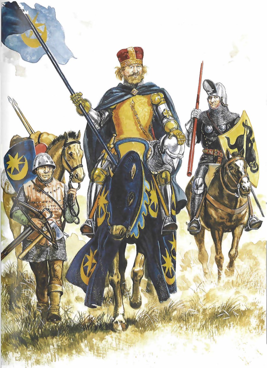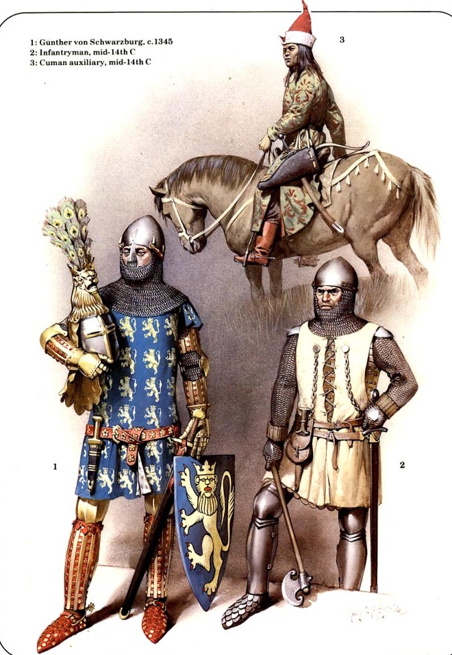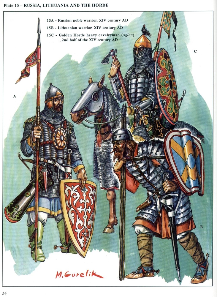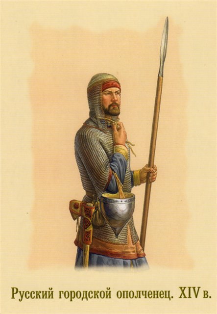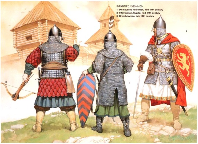 | Русская пехота 14 в. | немецкие рыцарь, пехотинец и наёмник кочевник | Русский, ордынец и литовец 14 в. худ. М. Горелик |