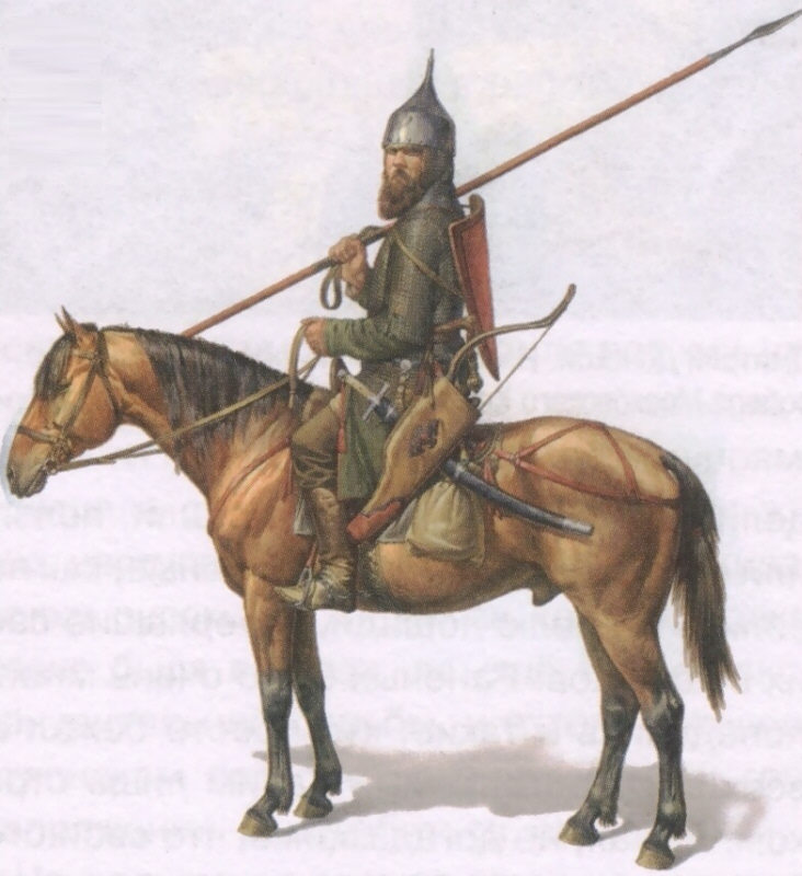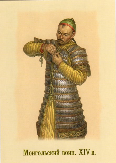 | Руские витязи | Худ. О. Фёдоров. Конный русский воин. XIV век. | Худ. О. Фёдоров. Золотоордынский конный воин. XIV век. |