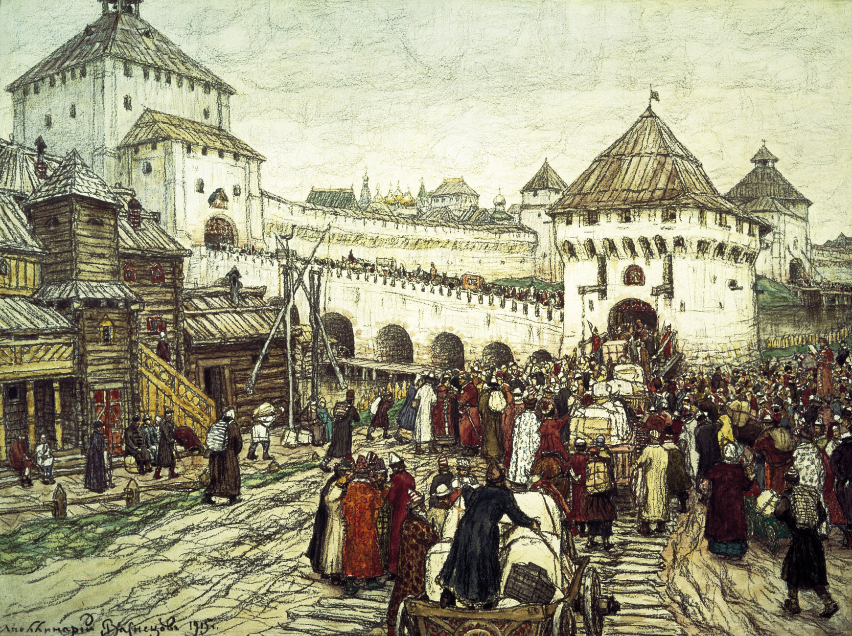 | Русский городской ополченец, 14в Худ. О. Фёдоров. | Монгольский богатый воин, 14в Худ. О. Фёдоров. | В осадное сиденье. Троицкий мост и башня Кутафья Худ. Аполлинарий Васнецов |