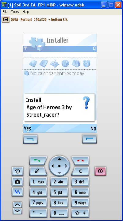 Итак, прежде чем запустить java игру вы хотите обкатать её на персональном компьютере. Для этого вам потребуется программа эмулятор мобильного телефона для java игр. Вместо кривого и глючного NHAL MIDP Runtime я предлагаю 3rd Edition FP1 SDK - отличный эмулятор для платформы S60 и разрешения 320*240, понимает все тоже что и телефон, можно загружать приложения с инета, можно локально, java, картинки, html. Это именно полный эмулятор мобильного телефона, с органайзером с будильником и и прочее. Он необходим в первую очередь программистам которые пишут программы и игры для платформы Nokia S60. В этом "виртуальном" телефоне они свои творения могут как следует протестировать и обкатать.