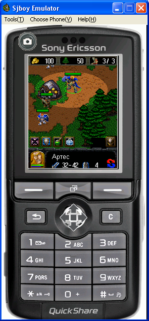 Minisoyo эмулятор для ПК также требует Java Runtime. Но архив занимает 1.8 мб. распакуйте его и запускайте minisoyo_EN.exe. Выбирайте Start → open и выбирайте нужный *.jar  файл. вроде бы он даже поддерживает игры по сети. Рабочий интерфейс программы поделен на три вертикальных блока. Левый - чисто информационный, в нем отображаются данные о Minisoyo, а также сведения о запускаемых мидлетах. В правой части экрана расположилась клавиатура виртуального мобильника, в средней - его дисплей, своими внушительными размерами намекающий на игровую предрасположенность эмулятора. Сам дисплей масштабируется нажатиями правой/левой кнопок мыши, а в меню View и Config можно управлять сглаживанием и частотой кадров выводимой на него картинки. Кроме того, в параметрах эмулятора присутствует опция деактивации функции хранения данных мидлетов на основе механизма Record Management System (RMS) и меню настройки клавиш компьютерной клавиатуры