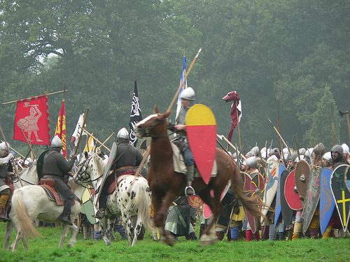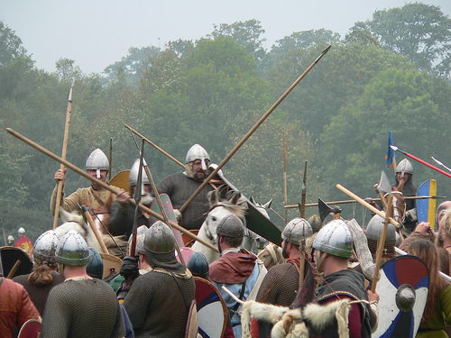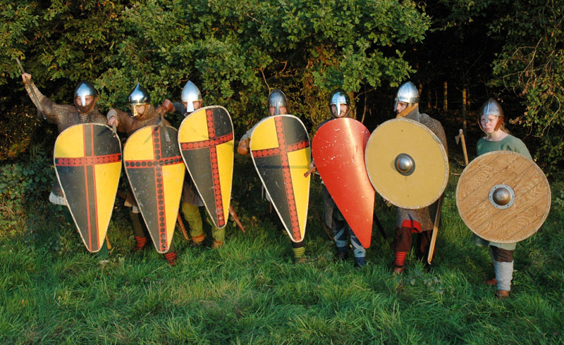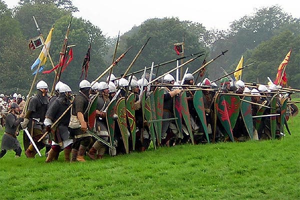 На рассвете 14 октября оба войска выстроились на своих позициях в том же боевом порядке, как и сотни лет назад, когда англосаксонское войско укрепилось на холмах, а норманны построились в линии для атаки. Первая линия нормандцев состояла из лучников, среди которых, кстати, было много женщин и детей (в Европе на историческую реконструкцию ездят всей семьей -глава семейства с мечом, а домочадцы - с луками). Прямо за лучниками выстроилась легкая пехота, а уже за ней - тяжеловооруженные воины в кольчугах, шлемах, с большими каплевидными щитами. В центре и на флангах стройные ряды пеших норманнов замыкала конница - оплот и надежда всего войска. Вильгельм, верхом на черном коне, объезжал ряды своего воинства и призывал их к доблести. Монахи перед строем читали молитвы и благословляли воинов. Что же касается саксов, то их пехота все плотнее сдвигала ряды щитоносцев, готовясь к серьезной атаке вражеских лучников. Достойное количество своих стрелков английское войско противопоставить врагу не могло, что в дальнейшем сыграло на руку норманнам. По сути, из преимуществ у саксов была только выгодная позиция для обороны, поскольку наличием достойной кавалерии похвастать они тоже не могли. Зато о норманнских всадниках хочется рассказать многое: блестящая выучка, слаженность в действиях, высокий уровень антуража превратили появление конницы на поле брани в настоящее шоу. Однако стоит заметить, что ее действия против пехоты противника носили скорее «декоративный» характер.