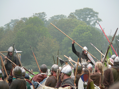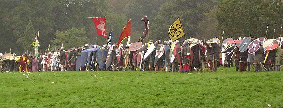 И вот, под воинственные крики воинов, Вильгельм пронесся на коне перед своим войском. Короткое воззвание, шеренги лучников двинулись на врага и на головы саксов полетели тучи стрел. Судя по насмешливым возгласам противников, норманнские стрелы просто не долетели до саксов - те стояли слишком далеко. Дождь стрел еще некоторое время поливал строй англичан без особого успеха, после чего нормандская пехота двинулась в наступление. Особыми статью и выправкой выделялись ратники французских и бельгийских военно-исторических клубов, что неудивительно - для них )то «родной» раздел истории. Одолев крутой склон, пехота норманнов широким фронтом атаковала ряды неприятеля и начался бой. Правое крыло нормандской армии, целиком состоявшее из тяжелой пехоты, попыталось обойти и сразу рассечь оборону саксов. Но заранее было видно, что эта затея обречена. Английские воины, вооруженные секирами, просто отбросили первые ряды норманнов. Атакующие были вынуждены отойти, и лишь их лучники и пращники спасли отступавших от полного разгрома. Саксы выразили свою радость грохотом щитов и победными воплями.