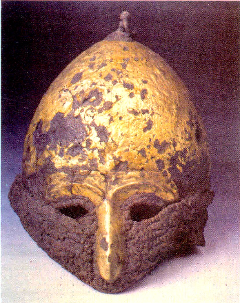 | Костяные рукояти ножей, инкрустированные серебром с позолотой. | Позолоченный шлем с железной полумаской. |