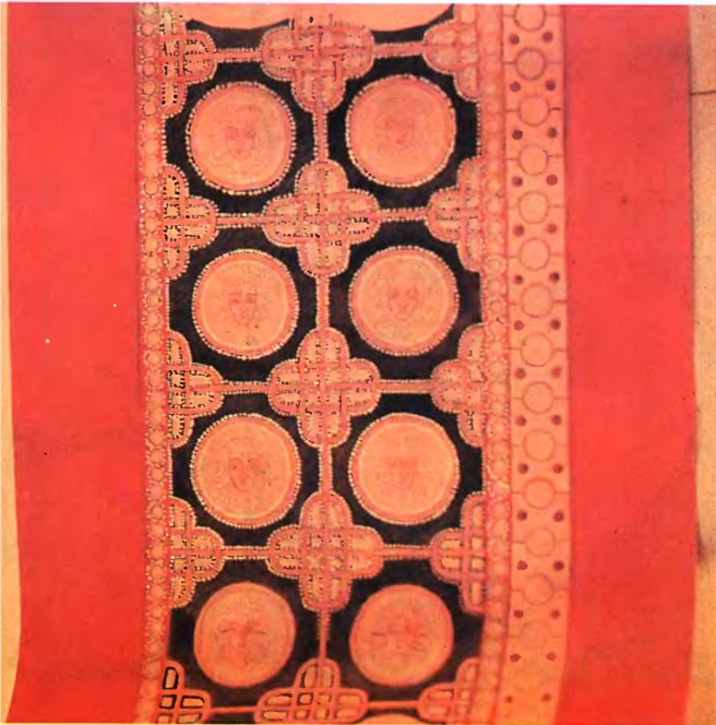 Узоры шитья, материалы, техника исполнения — все в этих находках утверждает в мысли, что ткани происходят из Византии. На редкость богатый набор константинопольской «текстильной галантереи»: златотканые ленты любой ширины, от совсем узких, в полсантиметра, до невиданных прежде — широких, в десять сантиметров, с разнообразнейшими узорами.
