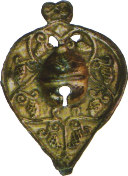 Подобные сердцевидные бляхи с выпуклой центральной частью, выполненной в виде колокольчика, некогда украшали сбрую лошади. Появившись в IX веке, они распространялись преимущественно в культуре енисейских кыргызов. IX–X вв. Минусинская котловина. МКМ