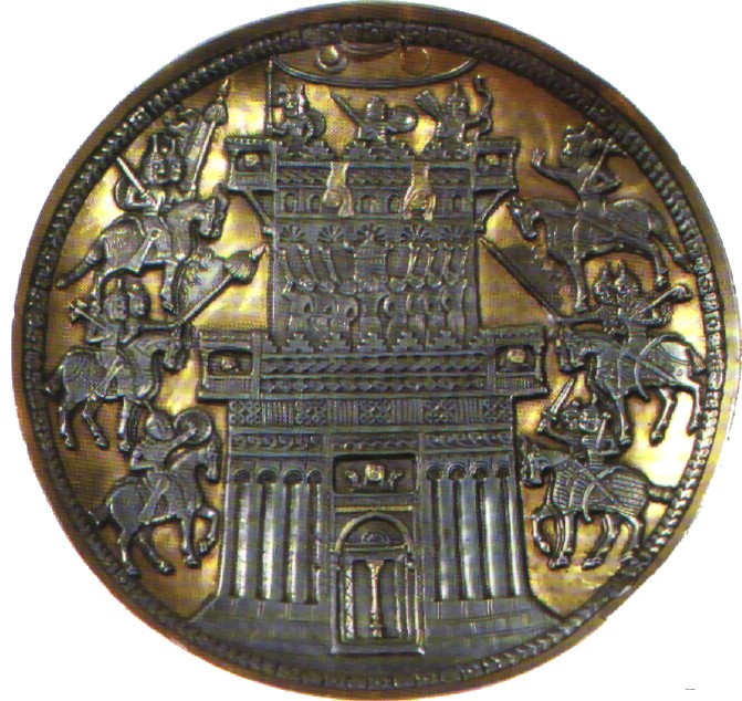 Серебряное блюдо с позолотой - характерный образец восточного экспорта, обнаруженный в Нижнем Приобье близ поселка Верхне-Нильдино. На его поверхности рельефо отлита башня, окруженная десятью тяжеловооруженными всадниками на закрытых панцирями лошадях. По мнению специалистов, изображение на поверхности блюда представляет собой серию сюжетов, которые можно трактовать как иллюстрацию к некоторым эпизодам им книги Иисуса Навина. Это изделие является двойником знаменитого аниковского блюда, найденного в 1909 г. в Прнуралье вблизи деревни Больше-Аниковская Чердынского уезда Пермской губернии и хранящегося ныне в Эрмитаже. Однако, при полном тождестве композиции, сюжета, контуров башни, абриса фигур людей и лошадей, между блюдами существует несколько десятков различий в деталях архитектуры, экипировки и вооружения всадников. Отлито верхненнльдинское блюдо в IX–X вв. По оригиналу VIII в. Сборы И. Н. Гемуева и А. В. Бауло. МА ИАЭ'Г СО РАН