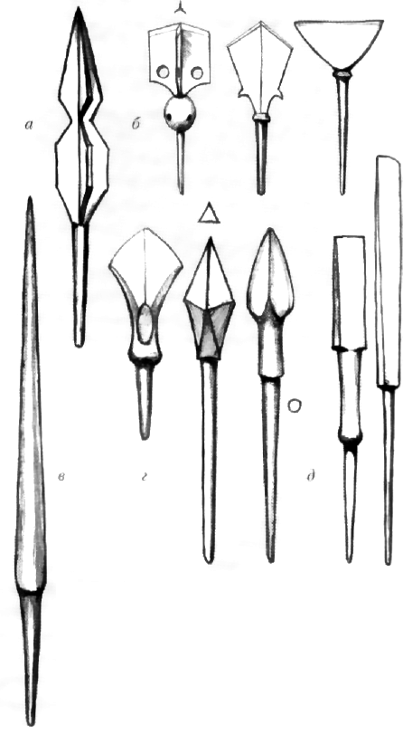 а-д. Некоторые типы наконечников кыргызских стрел. Стрелы с трехлопастными остриями предназначались для прицельной стрельбы по одиночной цели (а), плоские для массированного обстрела плотной воинской массы (6), шиловидные (в) - для борьбы с врагами, облаченными в кольчуги, граненые (г), долотовилные (д) - для поражения латников
