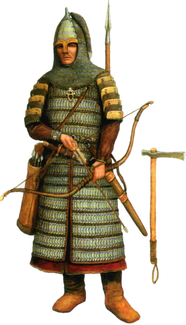 Позднее киргизская экипировка и вооружение претерпели сильное китайское влияние. В результате киргизы внешне начали походить на монголов. Доспехи этого конника почти исключительно все состоят из железных пластинок, лишь шлем сделан из железных полос. Шнуры, удерживающие доспехи на теле, закрыты металлическими накладками на груди и плечах. Пластинчатые поручи  защищают предплечья. Конные доспехи кожаные.