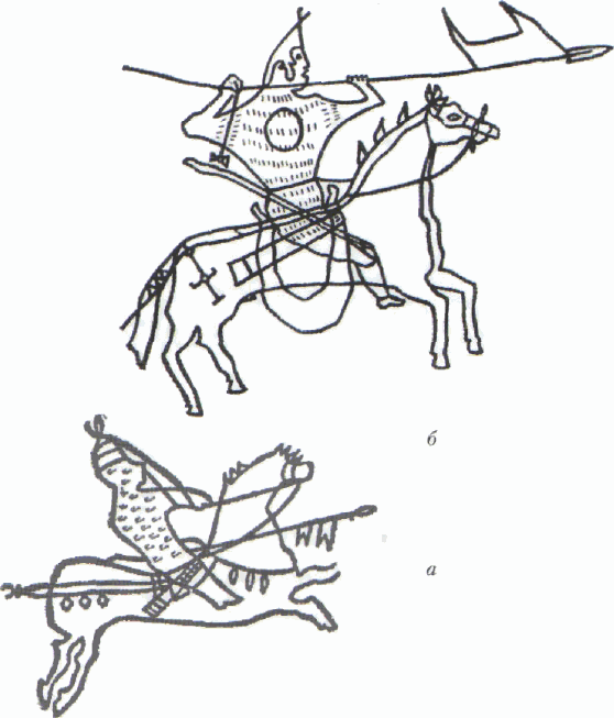 а, 6. Наскальные рисунки Сулекской писаницы. Латник (а), чтобы нанести мощный таранный улар копьем, опирает конец украшенною флажками древка о жесткий каркас седла. Голову воина защищает клепаный из концентрических колец шлем с небольшим плюмажем и бармицей - судя по всему, кольчужной (как и сами доспехи). Бронированный всадник (б) демонстрирует прием владения копьем. Зажав древко двумя руками, он наносит удар сверху вниз. Чтобы свести к минимуму возможность собственного поражения, он развернулся к нему боком. После удачно проведенного нападения всаднику, потерявшему копье, скорее всего, придется вступать в ближний бой, к которому он уже готов. Об этом свидетельствует боевой топор, висящий на кисти его правой руки. На груди воина, поверх ламеллярного панциря, хорошо заметен круглый деревянный щиток (именно таким он описан в летописях). Ряды пластинчатого набора доспехов обозначены короткими вертикальными штрихами. Голову воина закрывает высокий конический шлем с длинными наушами и назатыльником, увенчанный, вероятно, пучком перьев. Копье и топор дополняются луком в длинном узком налучье, размещенном вдоль правого бедра, и колчаном со стрелами, подвязанным к поясу с этой же стороны. Пах всадника защищает передняя лука седла. Конь под воином не бронирован, панцирь воина достигает лишь середины бедра. Отсюда можно сделать вывод, что перед нами средневооруженный воин второго эшелона. Манера копейного боя (в верхней плоскости - поверх плеча передней шеренги) лишь подтверждает эту мысль. Конец 1-го тыс. н. э. Сулекская писаница. Средний Енисей