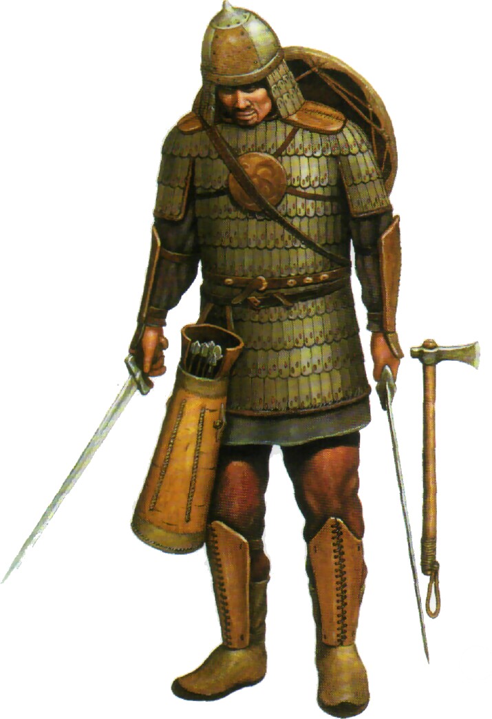 тяжеловооруженный киргиз-воинКыргызский тяжеловооруженный воин эпохи Великодержавия. Его защитное вооружение состоит из крупнопластинчатого клепаного шлема (а) с бармицей (б), изготовленной из металлических пластин и снабженной мягкой подкладкой: короткополого панциря (в), сплетенного шнурами из железных пластин; накладных деревянных щитков (?) на плечах и груди; также деревянных поножей (д) и наручей (е); щита (ж), собранного из обтянутых кожей дощечек. При атаке в конном строю или стрельбе из лука щит забрасывался за спину, где удерживался с помошью специального ремня (з). На воине – два пояса. К «стрелковому» поясу кренится берестяной колчан (и) открытою типа, украшенный накладными костяными пластинками (к). В руках у воина две сабли – с брусковидным (л) и ромбовидным (м) перекрестиями. Дополняет вооружение ближнего боя узколезвийный топор (и) со шпеньком на обухе. Реконструкция по материалам Ю. С. Худякова