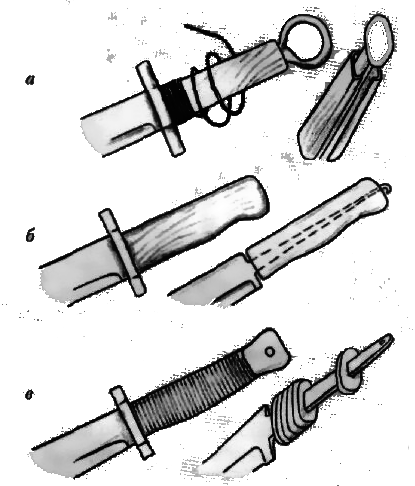 а - в. Рукояти оружия делались несколькими способами. Боковые накладки применялись тогда, когда рукояточный стержень снажался несъемным кольцевым навершием (а). В других случаях, деревянный брусок насаживался на тонкий приостренный черен, который, пройдя насквозь, загибался с обратной стороны (б). Далее брусок обстругивался, и ему придавалась нужная форма. Рукоять могла набиратъся из кусочков вываренной бересты или толстой кожи, нанизанных на черешок послойно (в). Через отверстие на самом конце стержня пропускалась заклепка, фиксировавшая всю конструкцию