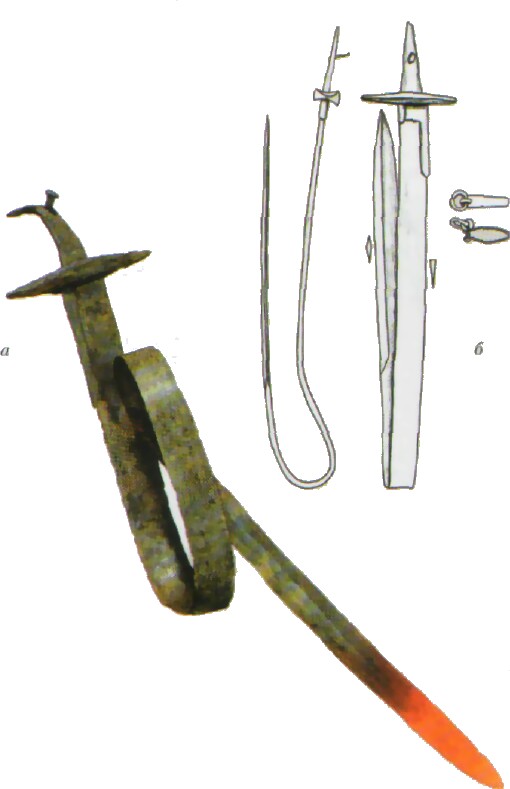Тела умерших воинов енисейские кыргызы предавали огню. Вместе с телами жаркое пламя пожирало воинскую амуницию и погребальный инвентарь. Раскаленные в погребальных кострах клинки намеренно портили - сворачивали в кольцо (а) или сгибали пополам (6). Возможно, так боролись с вредоносной магией покойника, а возможно, «транспортировали» предметы в иной мир, где все было наоборот: целое - сломанным, а сломанное - целым. XII–XIV вв. Минусинская котловина. а– Соян-сее, по Ю. С. Худякову; б - могильник на горе Самохвал, по Л. Р. Кызласову