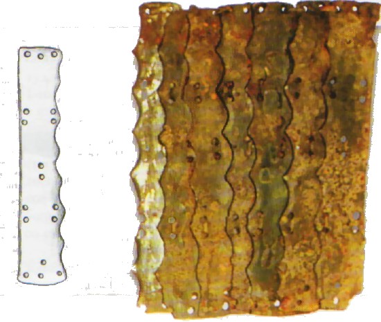 К концу 1-го тысячелетия появляются панцири с замысловатым контуром звеньев. У пластин плавно скругляются углы, вдоль краев чеканятся бороздки по периметру устраиваются бортики: пластины куются одной зубчатой стороной или в форме вытянутой восьмерки.