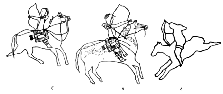 а – г. Легковооруженные всадники. Основное вооружение этих стрелков состояло из лука со стрелами. В ближнем бою они пользовались палашами или слабоизогнутыми саблями. Их экипировка включала также элементы защитного вооружения, в частности, накладные деревянные щитки. а - фигурка лучника, некогда украшавшая переднюю луку кыргызского седла. IX - X вв. Тюхтятский клад. Минусинская котловина. Минусинский музей; б, в, г - Сулекская писаница. Конец 1 тыс-, н. э. Средний Енисей