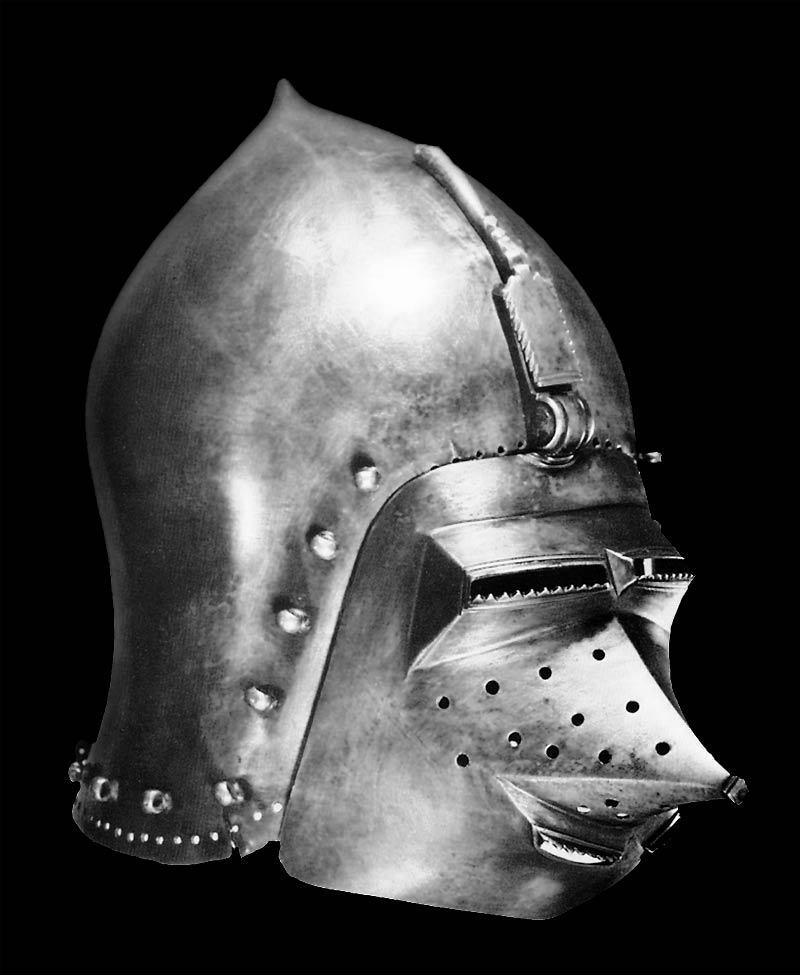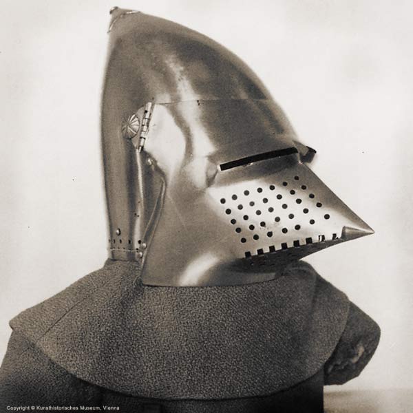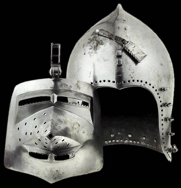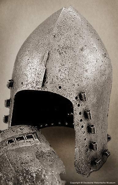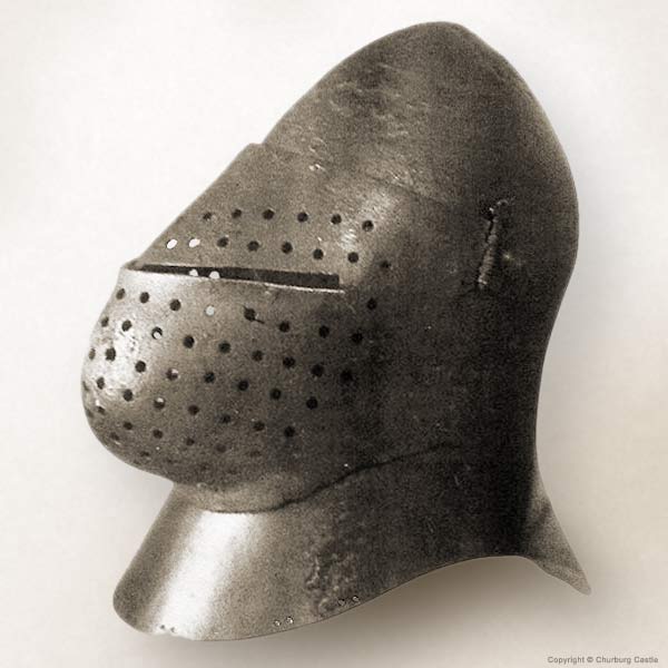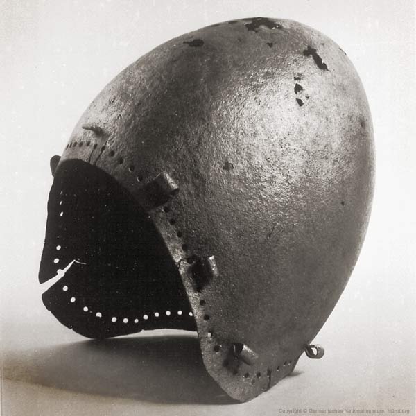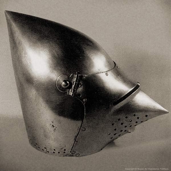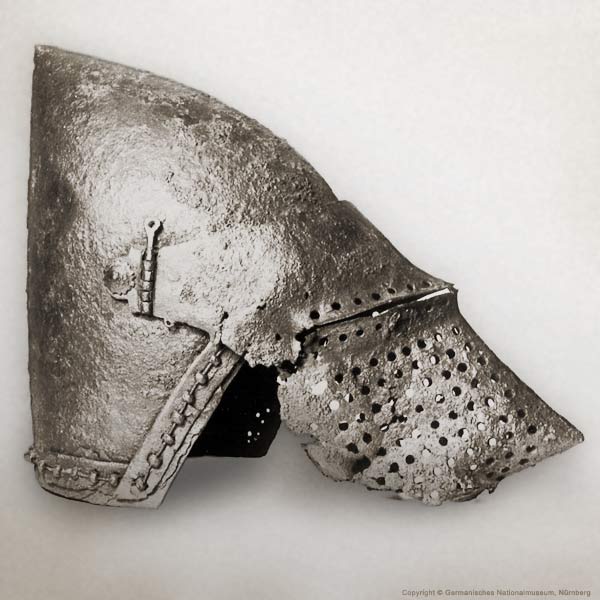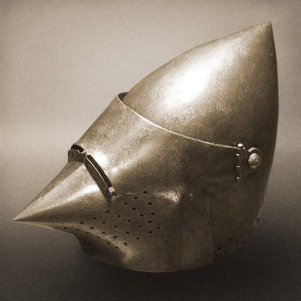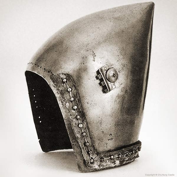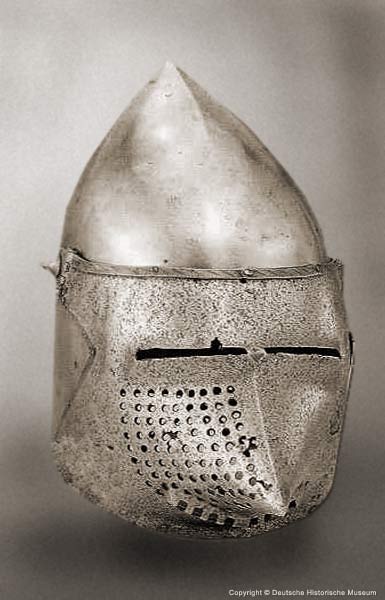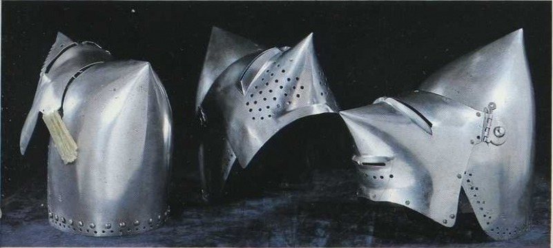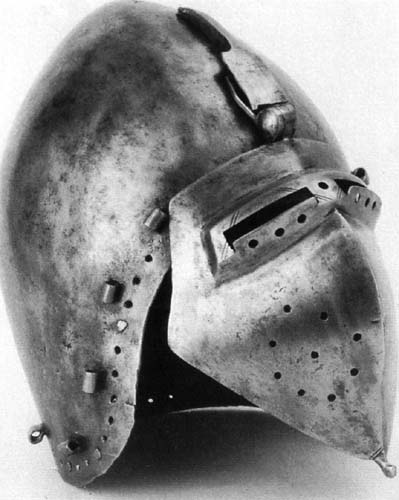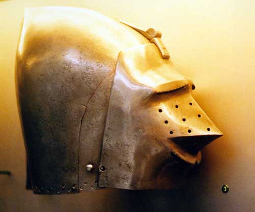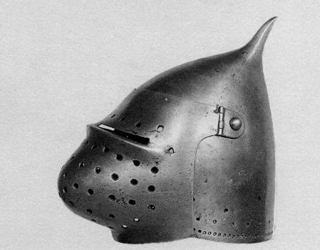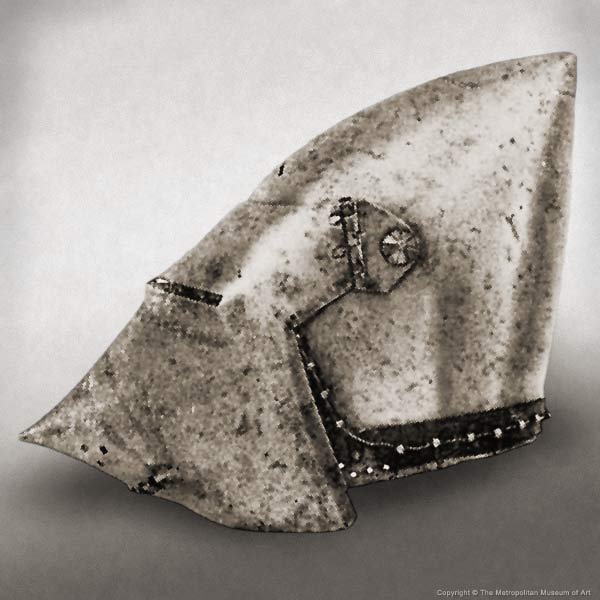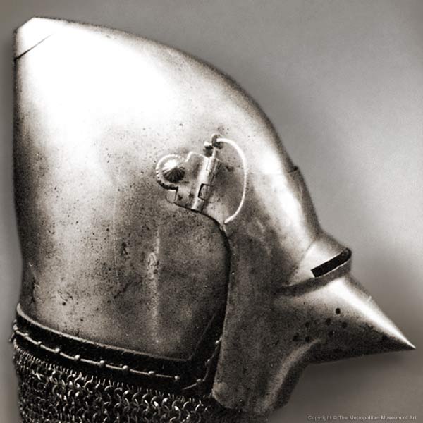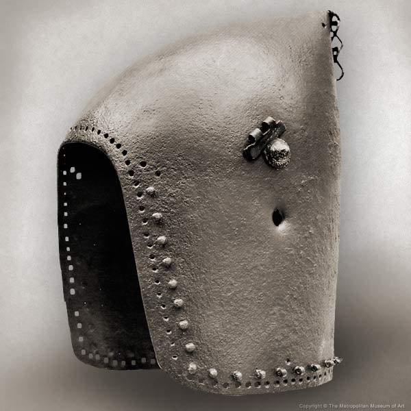 | Шлем из собрания замка Coburg, 1385 г. Очень красивий и очень изящный пример "чесночной головы" | Этот шлем формы "чесночная голова" также выставлялся в музее Метрополитен и датирован 1400 г. | |