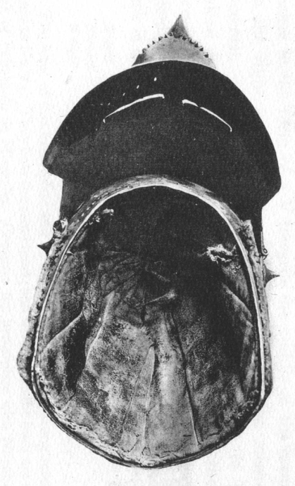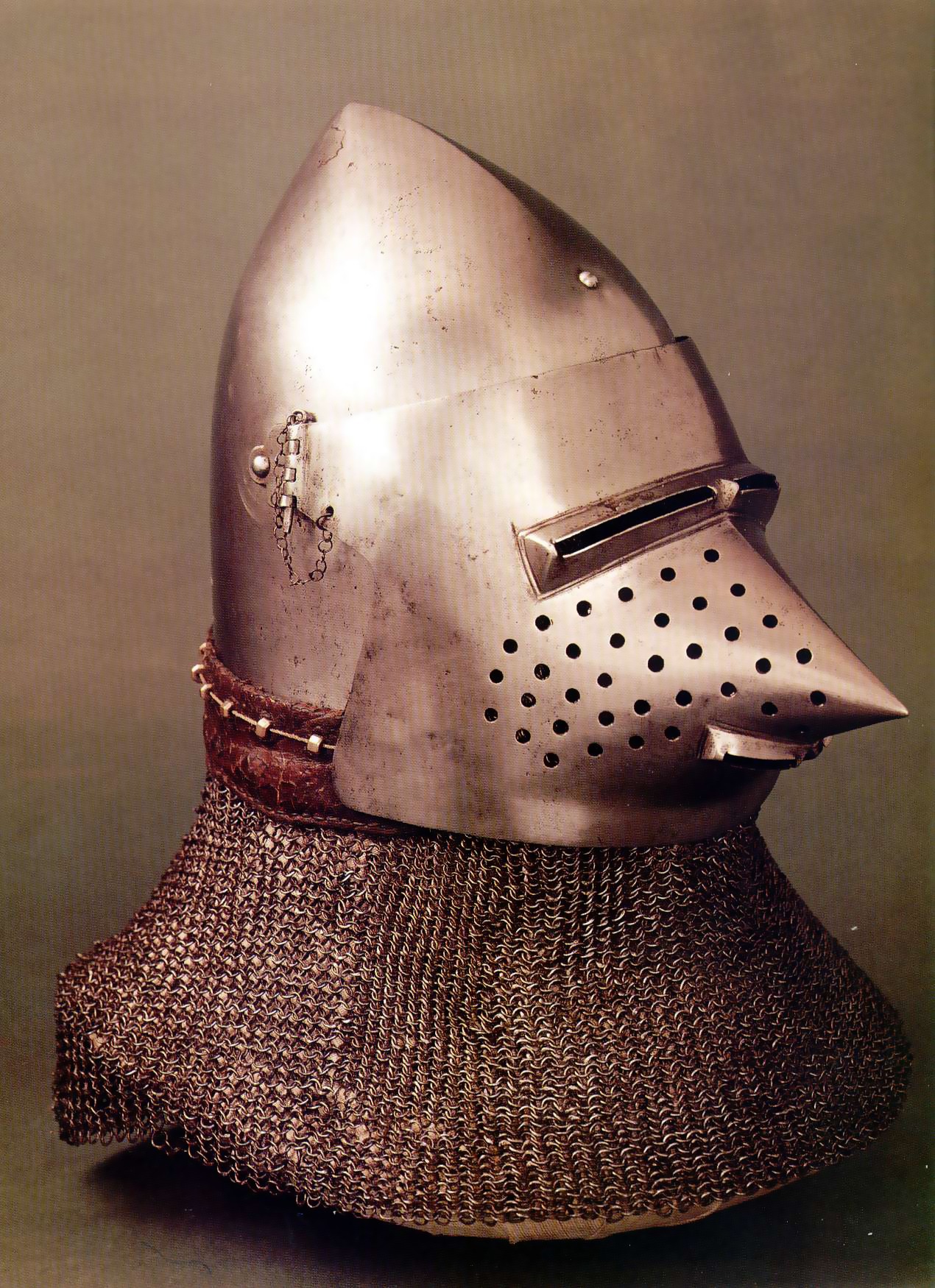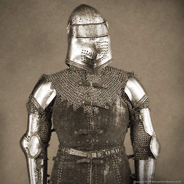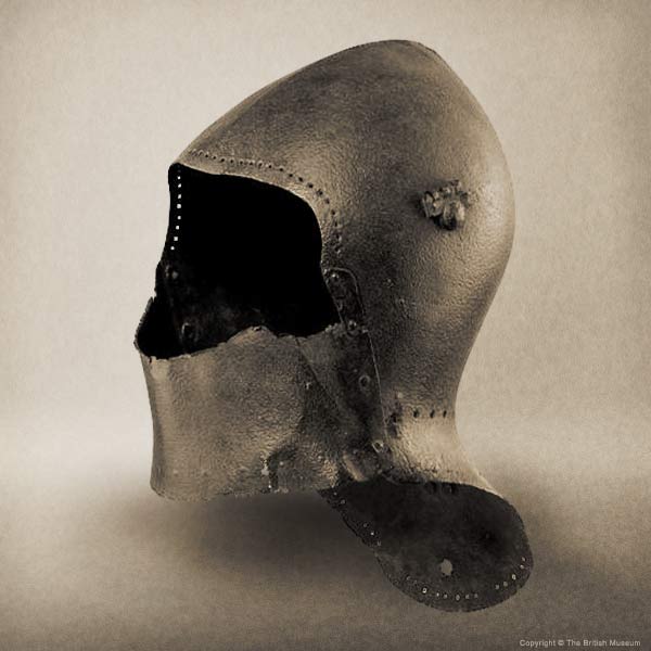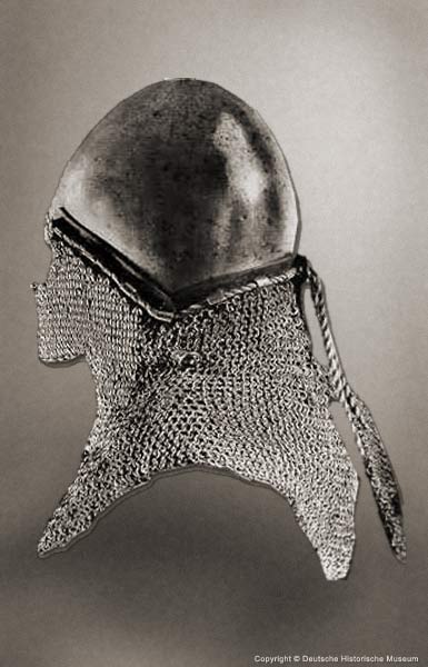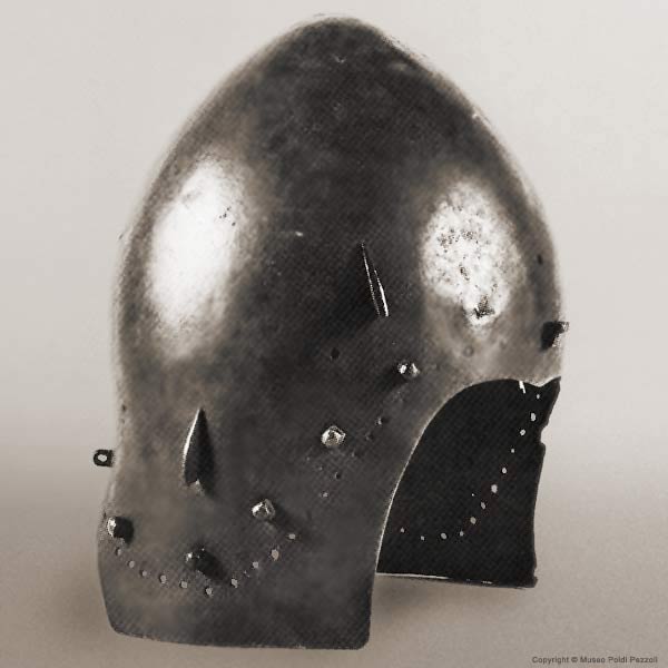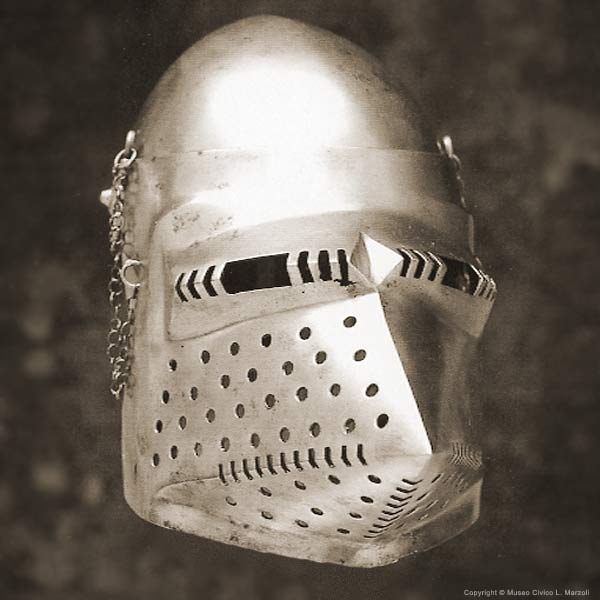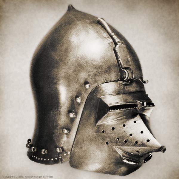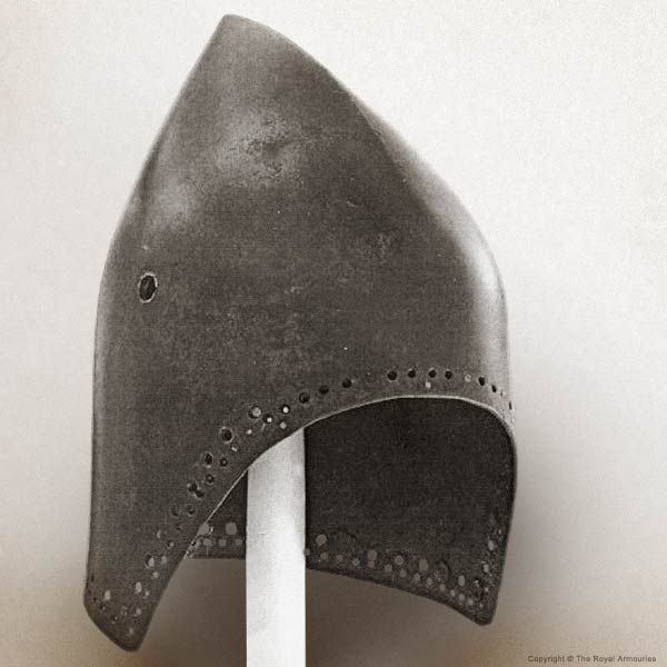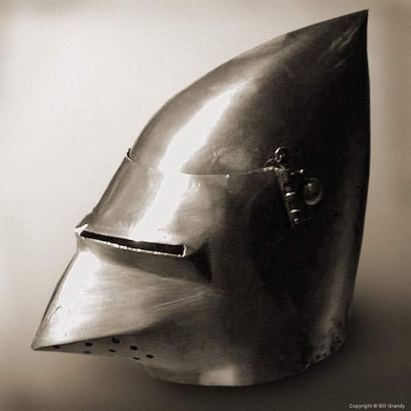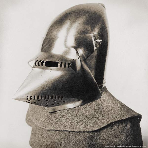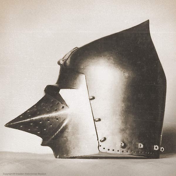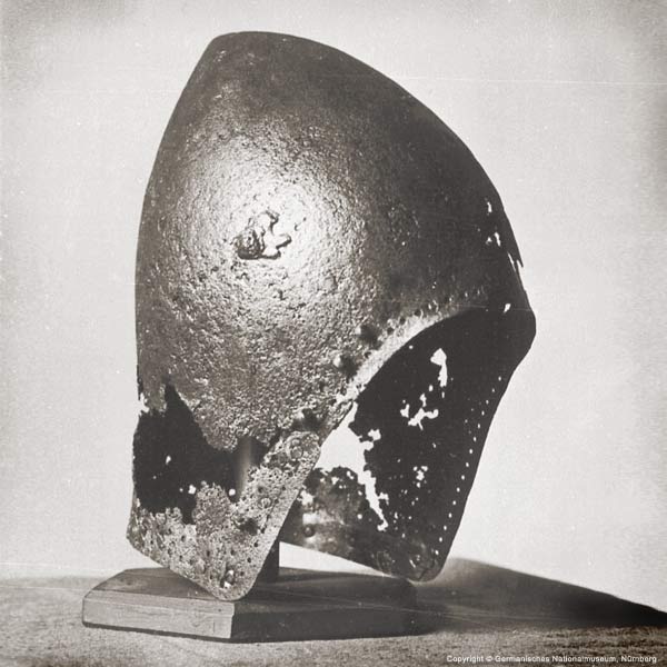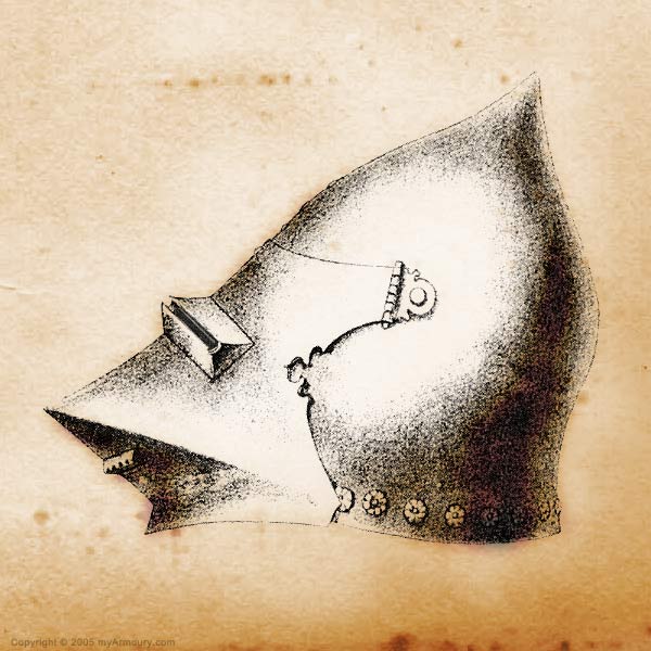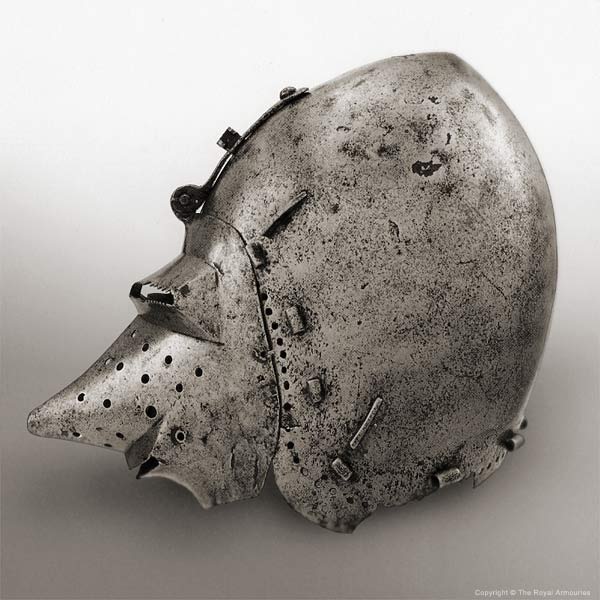 | Шлем из собрания замка Coburg, 1385 г. Очень красивий и очень изящный пример "чесночной головы" | Этот шлем формы "чесночная голова" также выставлялся в музее Метрополитен и датирован 1400 г. | |