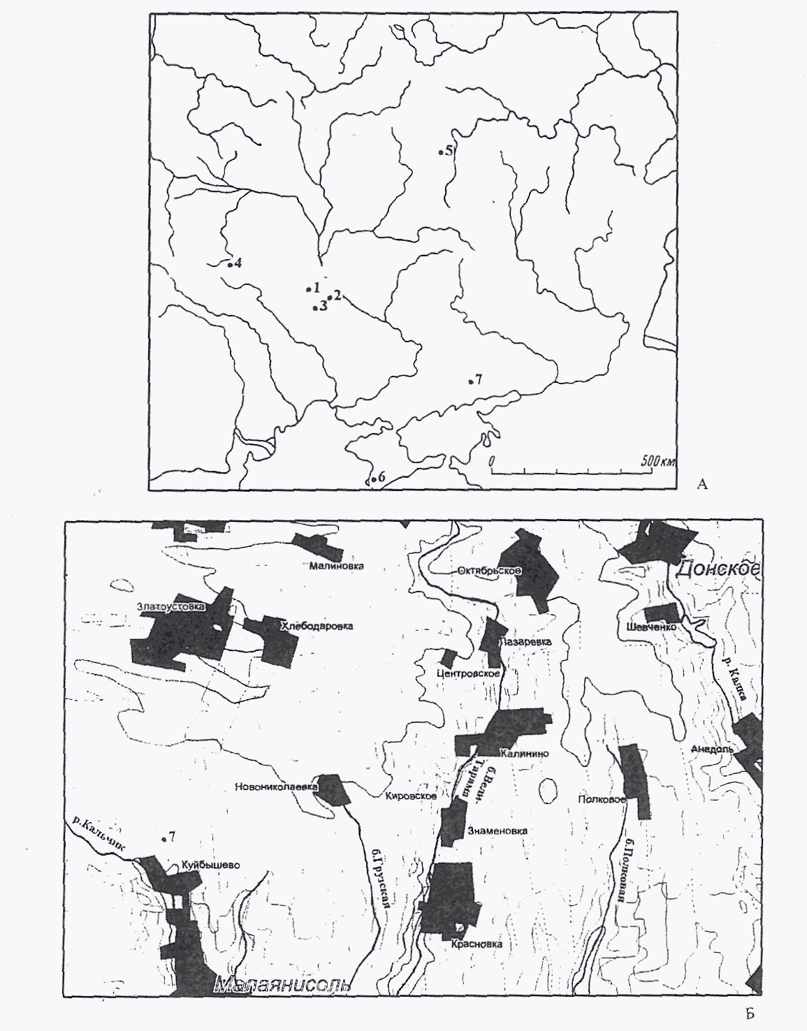 Abb. 1. A) Lageplan der Gesichtsmasken: 1 - Kovali; 2 - Lipovec; 3 - Rotmistrovka; 4 - Gorodistsche; 5 -Serensk; 6 - Cherson; 7 - Kujbyschevo (Komplex Kalka). Б) Lokalisierung des Komplex-Fundortes in der Nahe des Dorfes Kujbyschevo.