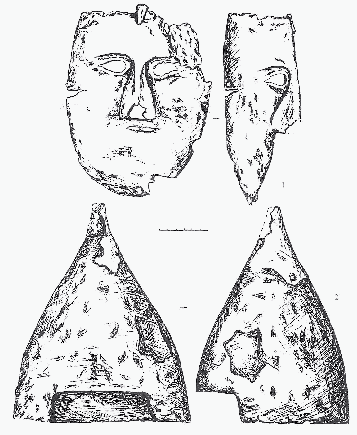 Маска овальной формы (рис.2, I), ее размеры 18x24 см. Изготовлена из листа железа толщиной 2-2,5 мм. Она имеет четко проработанные черты верхней части лица: слегка раскосые миндалевидные прорези глаз с оглазиями, составляющий прямую линию со лбом сильно выступающий нос, в нижней части которого имеются два подтрапециевидных отверстия для дыхания.