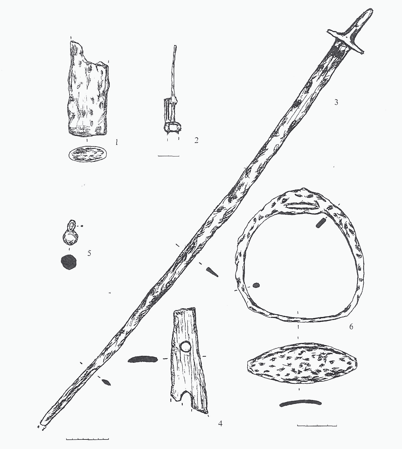 Dess. 3. Mobilier de la sepulture pres du village Kuibysevo. 1 ~ la pointe d'une gaine; 2 - vue de profil de la poignee de sabre; 3 - sabre; 4 -fragment de boucle d'un carquois; 5 - bouton de bronze en forme de boule; 6 - etrier
