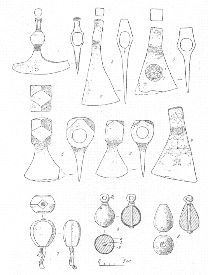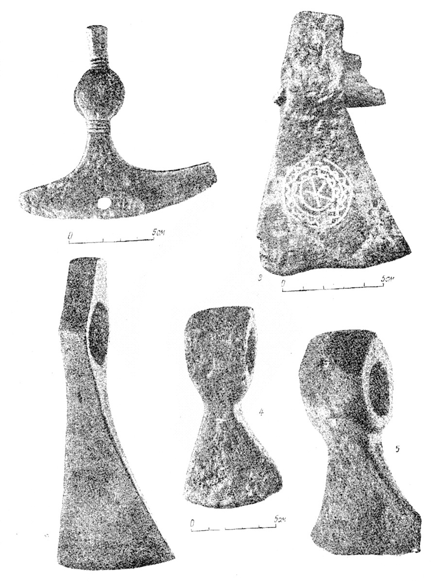 Все 3 топора очень близки по форме и размерам, все они с орнаментом, на обеих сторонах лезвия. На 2 топорах узор состоит из 3 концентрических окружностей и 2 волнистых линий, заключенных между ними; из центра расходятся 6 лучей (рис. 5, 3; рис. 6,3). Узор инкрустирован золотом. На третьем топоре узор – иного характера и выполнен насечкой из точек (рис. 5, 4). Эти топоры были пригодны и для борьбы с закованным в броню врагом.