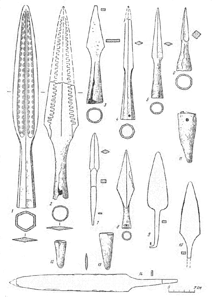 4, 5 - наконечники копий XIV в.; 6 – наконечная копья X–XI вв.; 7 - сулица XV в.; 8 - сулица X в.; 9 - сулица XIII в.; 10 – сулица XIII в.; 11-13 - втоки X–ХШ вв; 14 - железный кинжал X в.