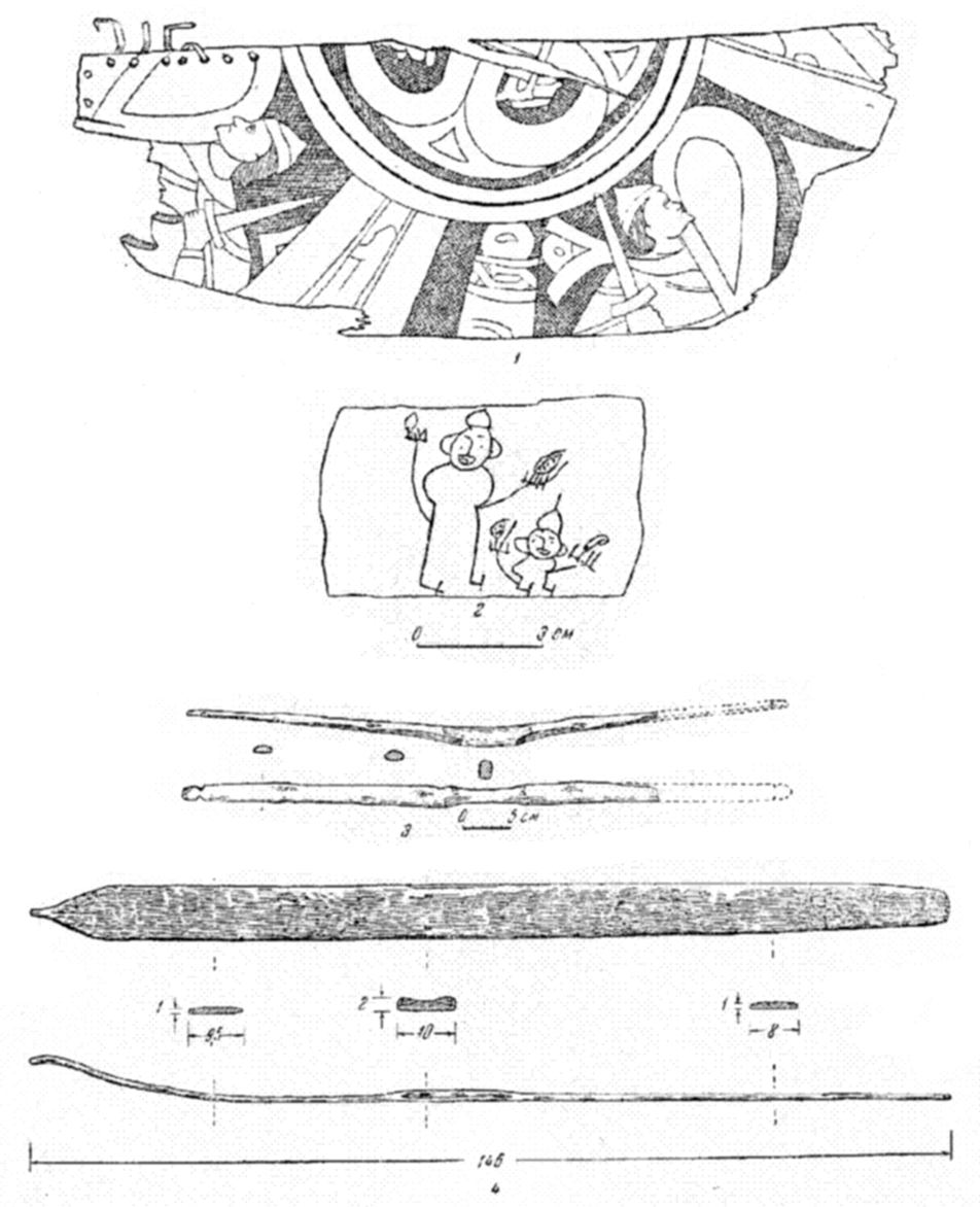 1 - обломок деревянного блюда рубежа XII и XIII вв. с изображением древнерусских воинои в шлемах, с мечями и щитами; 2 рисунок школьника на бересте с изображением воинов в шлемах шишаках (рубеж XII - XIII вв.);