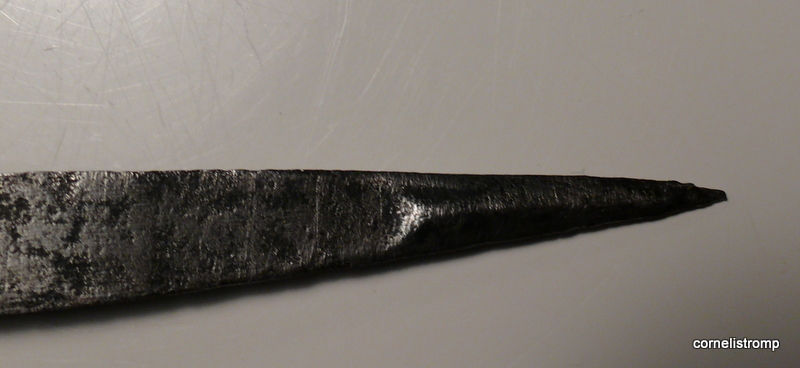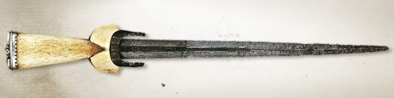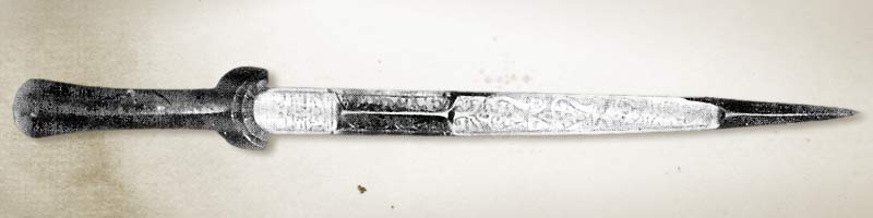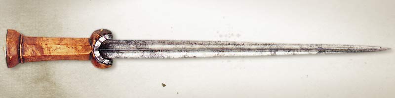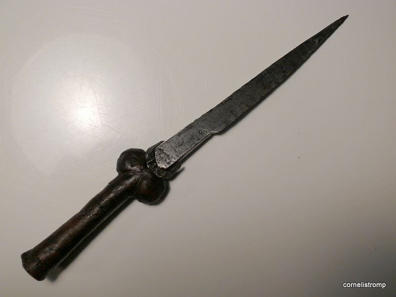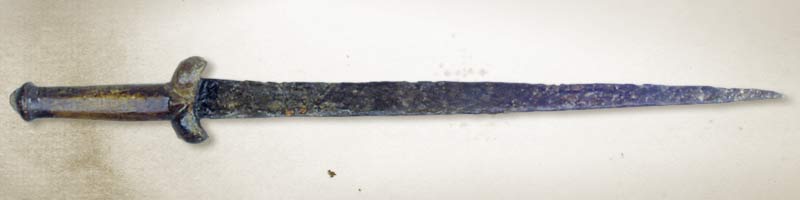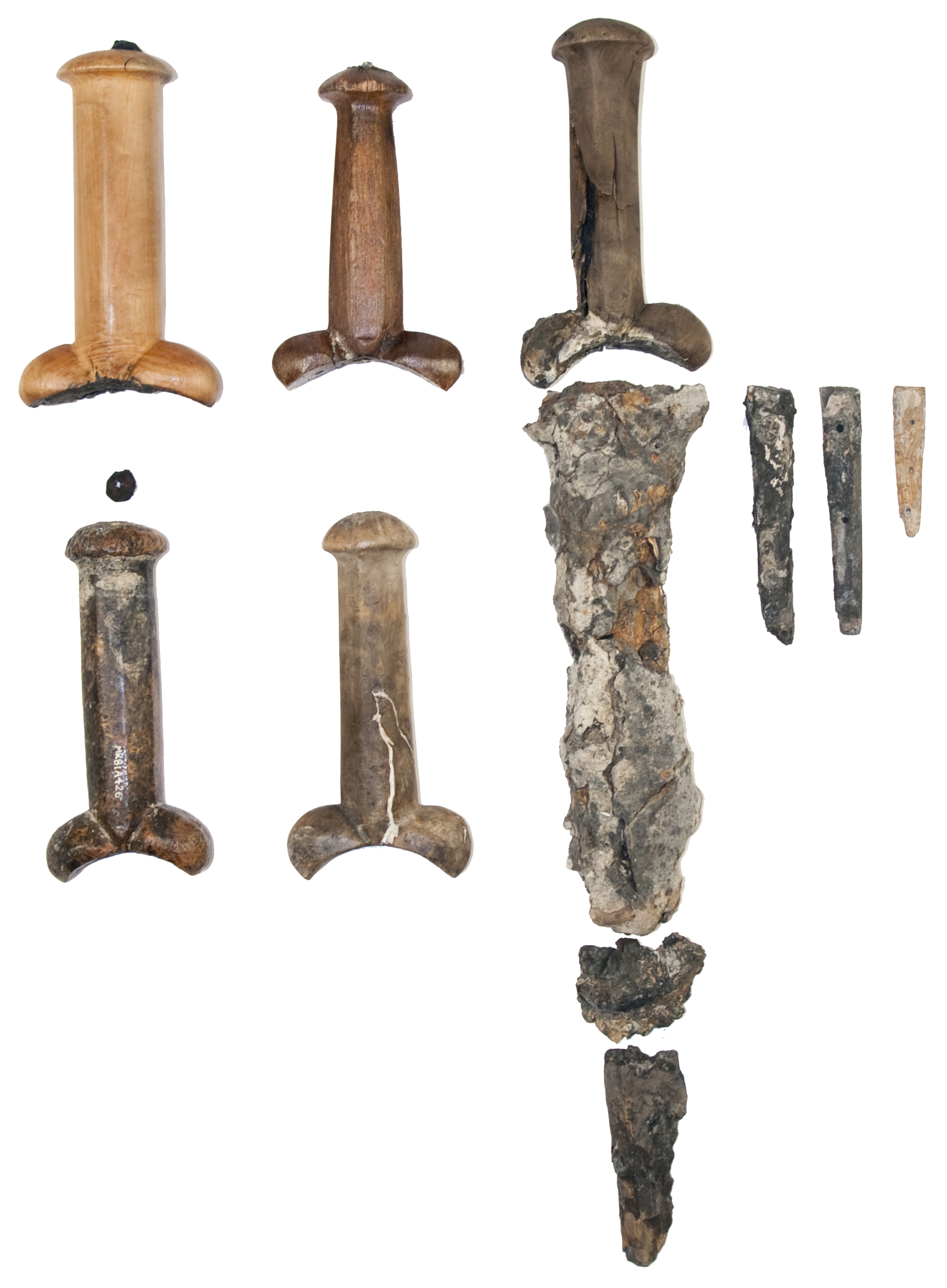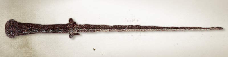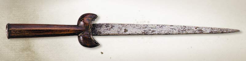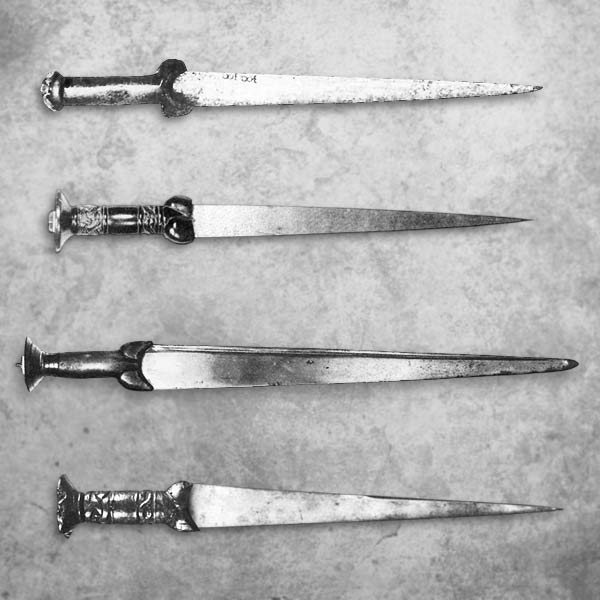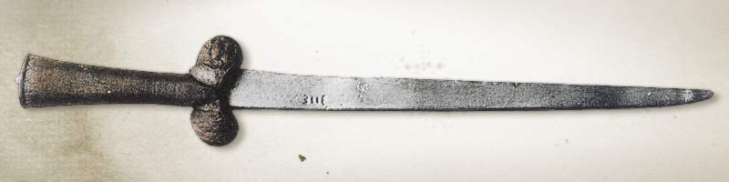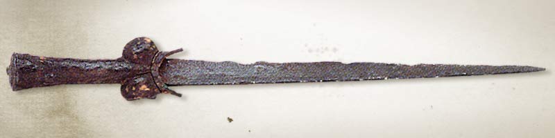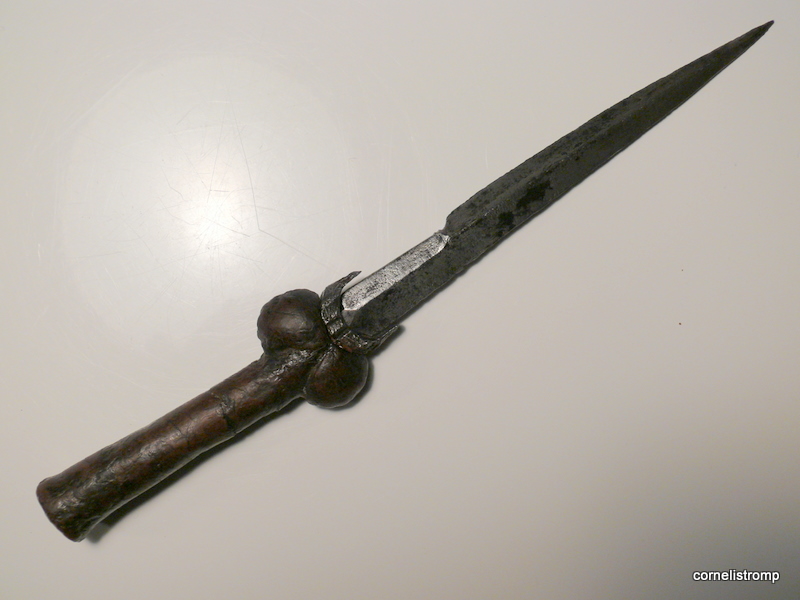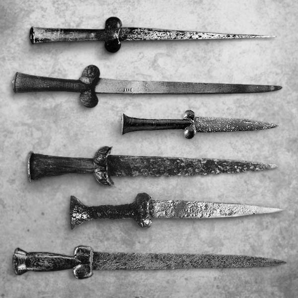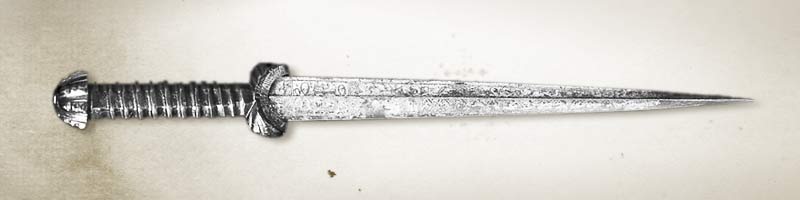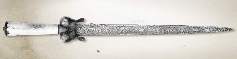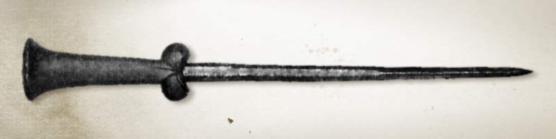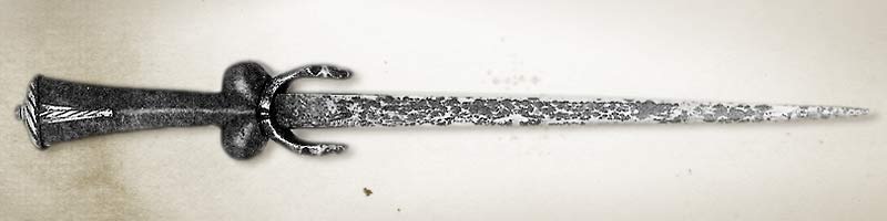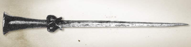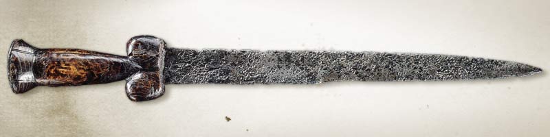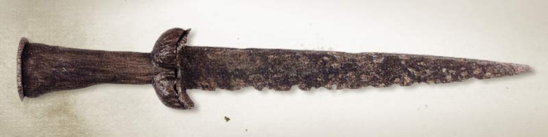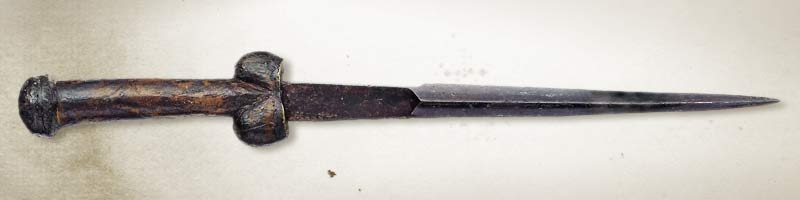 | С the Philadelphia Museum of Art. Это один из редких примеров трехгранного черенка рукояти, трехгранной гарды и трехгранного клинка. Кинжал обнаружен при раскопках в довольно плохом состоянии. |