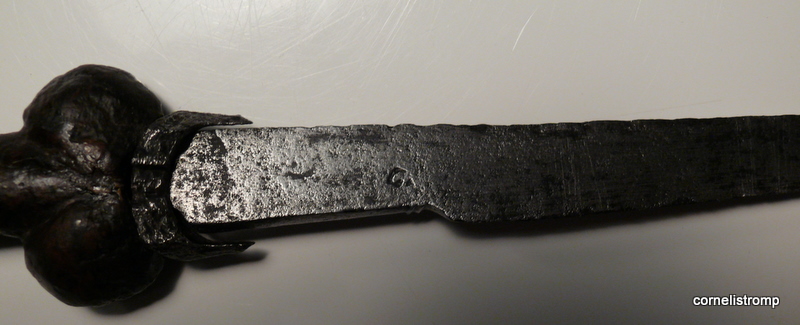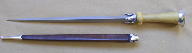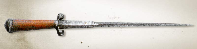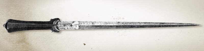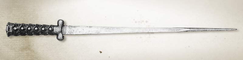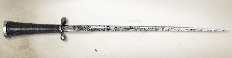 | Из Deutsches Klingenmuseum Solingen. Итальянский кинжал 15-го века, клинок имеет треугольное лезвие и широко расширяющийся черенок заканчивается металлическим диском. |