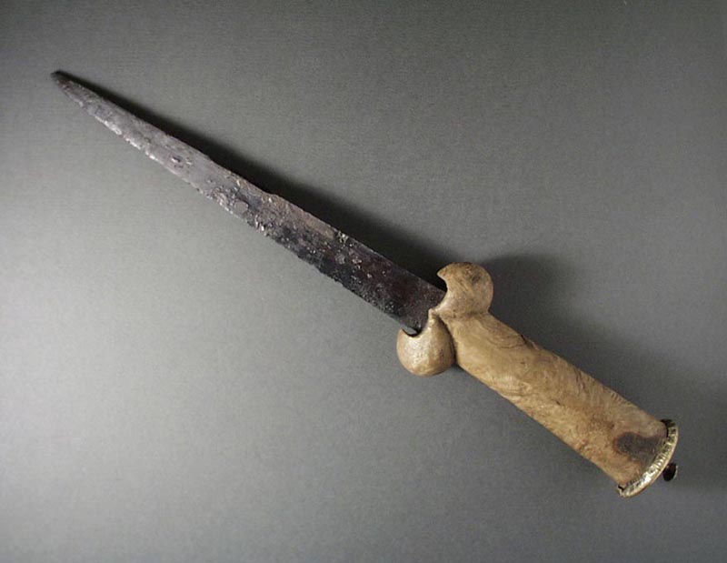 | От Royal Armouries at Leeds, Великобритания. Кинжал Баллок 15 века с черенком вырезанным из кости, с металлическим навершием, данный эземпляр был найден в Антверпене (Ирландия). |