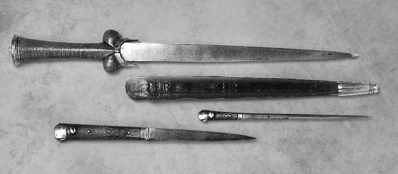 | Разнообразие кинжалов милосердия | Ранние шотландские кортики, очень похожи на кинжал Баллок | Баллок кинжал, Wallace Collection A732, показано с ножнами, шилом, и ножиком. |
