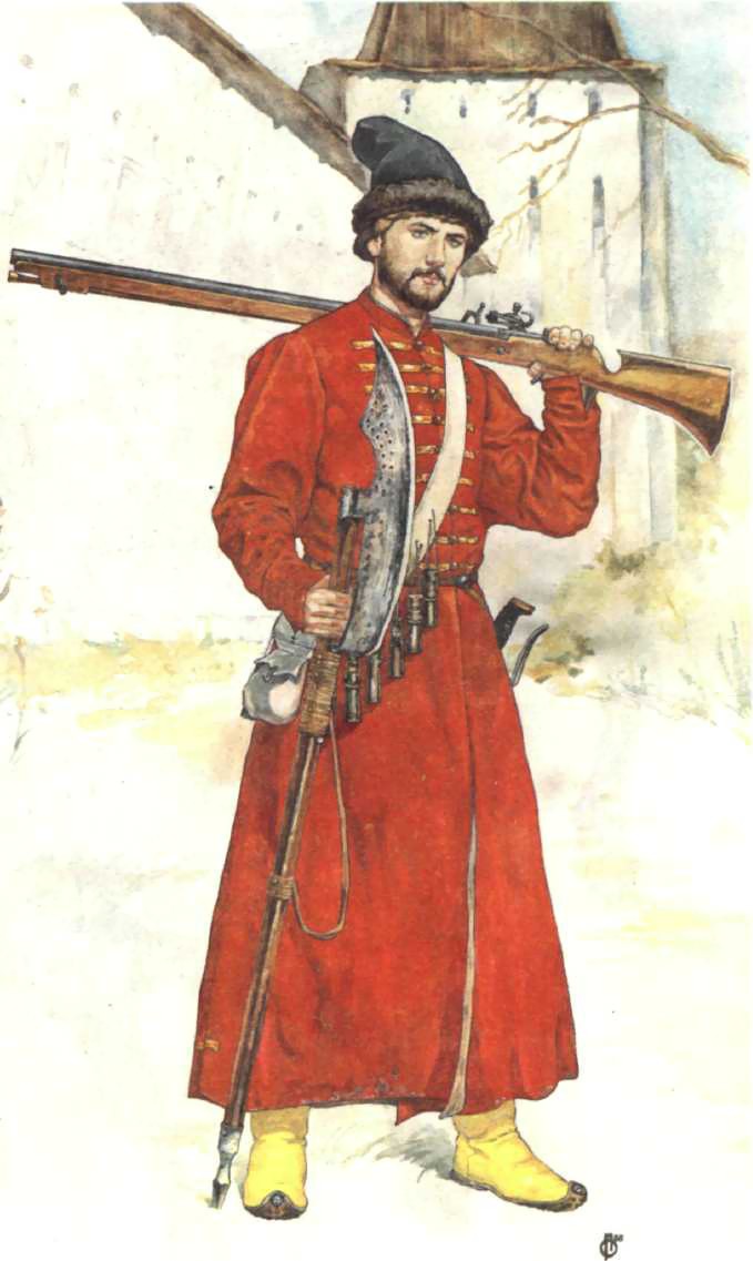 Закончим этот разговор сведениями из изданной в Швеции в 1660 г. книги Котошихина, касающимися московских стрельцов: «Да им же всем дается на платье из царской казны сукна ежегодно». И о стрельцах городовых: «... а на платье сукна посылаются в три и в четыре года». Вряд ли такое поистине замечательное снабжение существовало долго и существовало вообще. Городовые стрельцы, судя по всему, вообще не имели парадных «цветных» кафтанов.