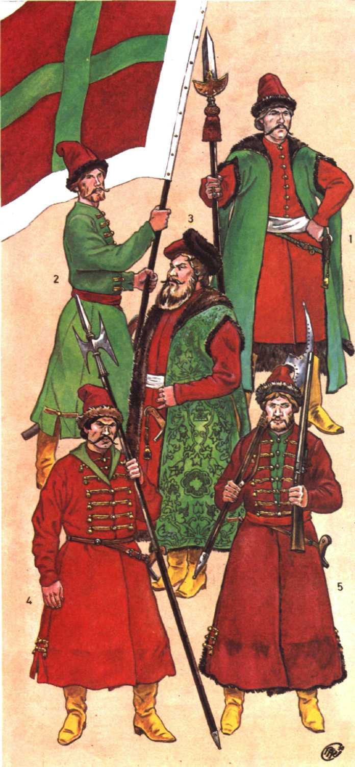 В. Парри, описывая царский выезд в 1599 г., упоминает царскую «...гвардию, которая была вся конная, числом 500 человек, одетых в красные кафтаны, они ехали по трое в ряд, имея луки и стрелы, сабли у пояса и секиры на бедре...». Однако у нас нет твердых оснований считать это первым упоминанием единообразного красного цвета для стрелецких кафтанов — «гвардией» иностранец мог назвать и жильцов, и еще кого-нибудь из «Государева полка».