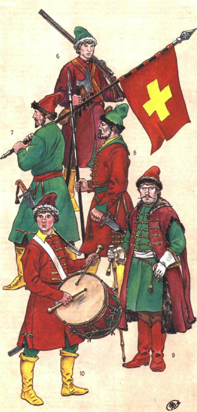 Скорее всего, на момент сформирования, да и долгое время после этого стрельцы какого-либо регламентированного в покрое и расцветке костюма не имели. Д.Горсей, говоря о московских стрельцах во времена Ивана Грозного, отмечал, что они «очень опрятно одеты в бархатные, разноцветные шелковые и стамедные (шерстяная косанит-ная ткань, - Р.П.) одежды». Он указывал также на разнообразие в расцветке стрелецких кафтанов: «...тысяча стрельцов в красных, желтых и голубых одеждах, с блестящими орудиями и пищалями расставлены в ряды своими начальниками».