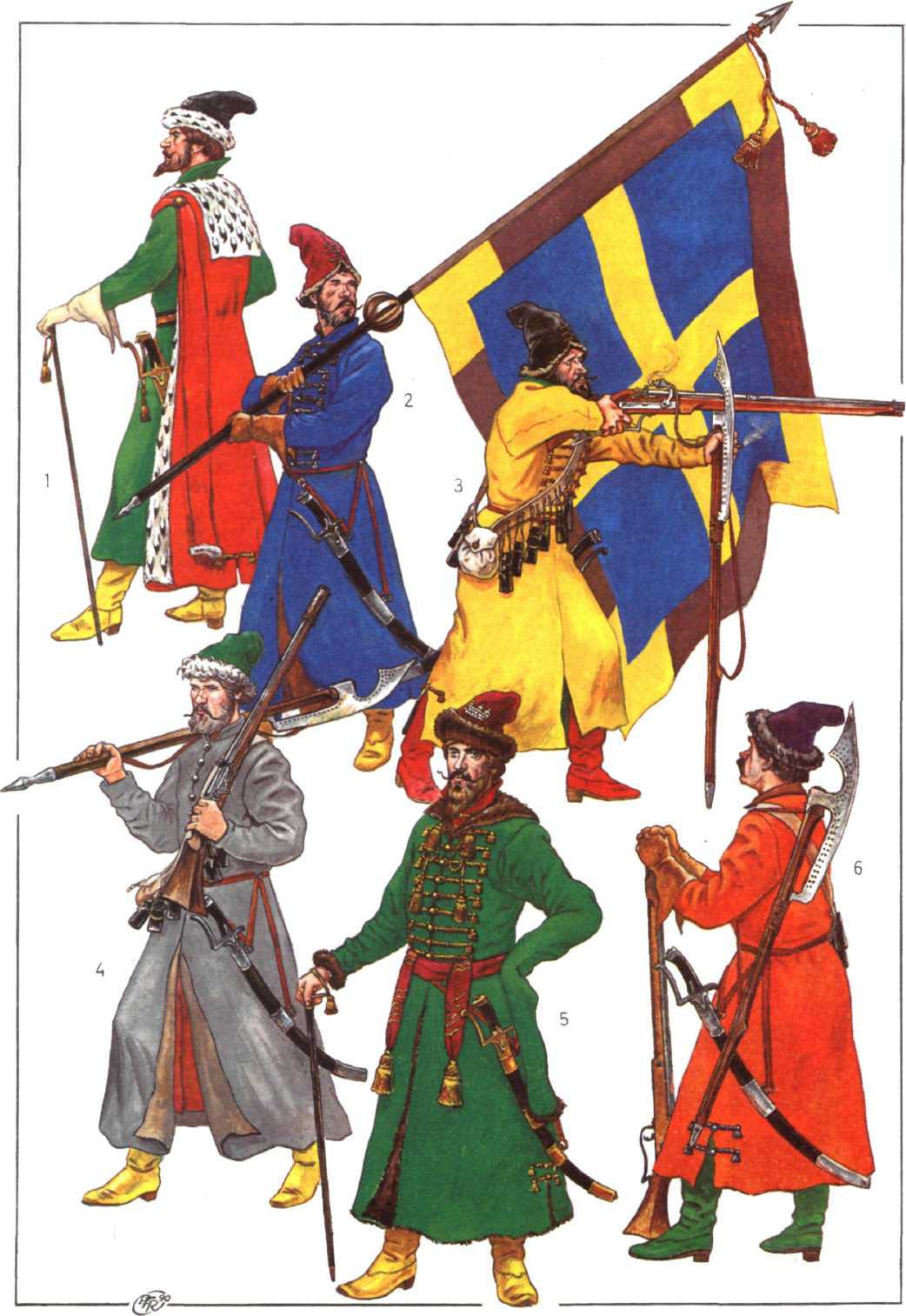 Чины московских приказов после 1672 г. (по Э.Пальмквисту): 1 Голова 1-го приказа Егор Петрович Лутохин; 2 Знаменщик с сотенным знаменем третьего приказа; 3 Стрелец 6-го приказа; 4 Стрелец 13-го приказа в походном («носильном») кафтане; 5 Начальный человек (пятисотский или сотник) 3-го приказа; 6 Стрелец 8-го приказа. Цветное платье и сотенные знамена московских стрелецких приказов. 1674 г. (по Э. Пальмквисту)