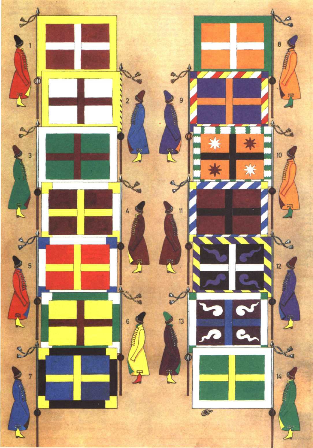 «Цветное платье» и сотенные знамена московских стрелецких приказов. 1674 г. (по Э. Пальмквисту):