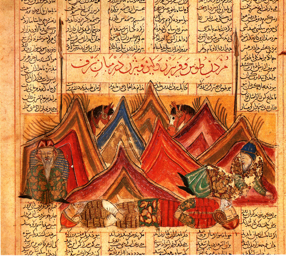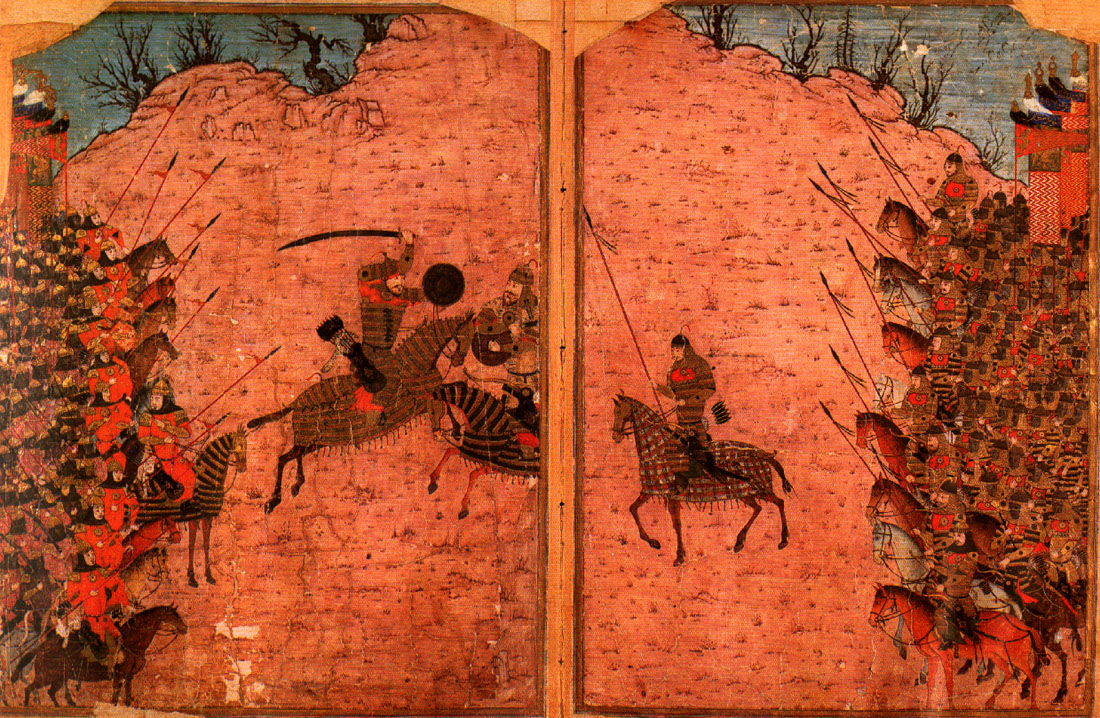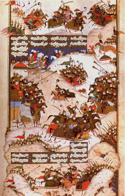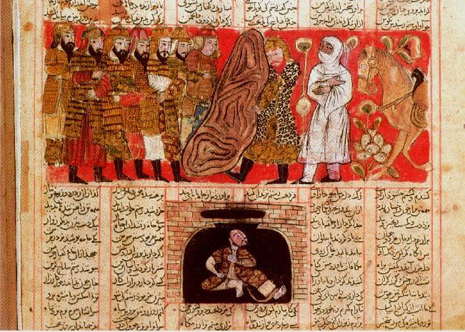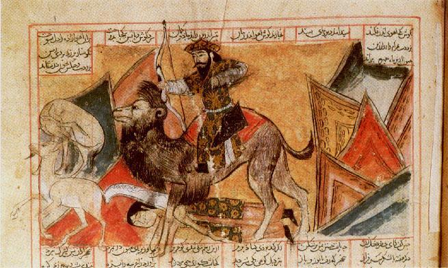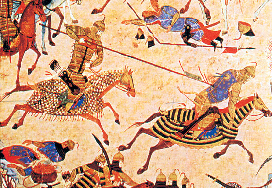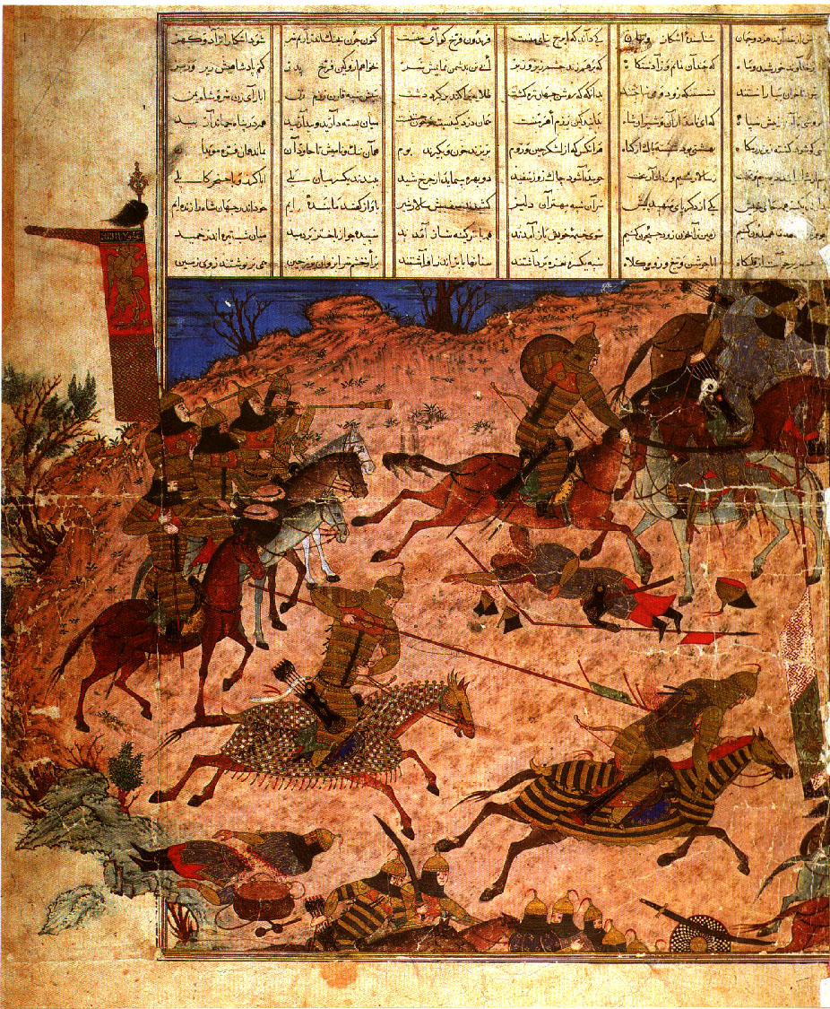 Преследование. Сцена из битвы при Бадре. Изобразительный источник на ламинарный доспех. Джами 'аль-Таварик ("Всеобщая история" Рашид аль-дин). Rashidiyya, 1314. Hazine 1653, фолио 165b |