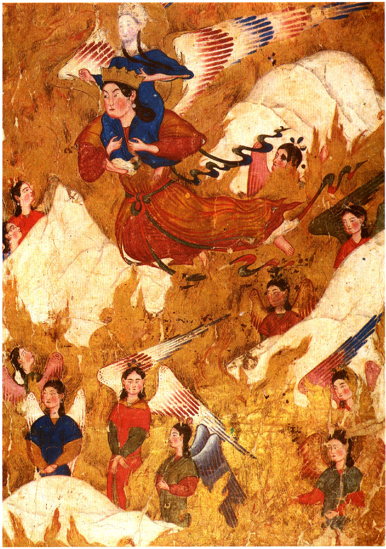 Гавриил несет Мухаммеда над горами Мирадж-наме (Вознесения Мухаммада). Топкапу Сарай. Тебриз, начало 14 века. Hazine 2154, фолио 42b |
