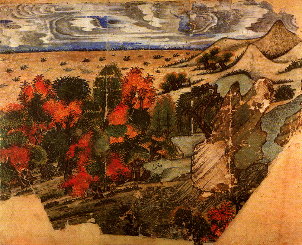 Летний пейзаж. Из the Sarai Albums. Тебриз, середина 14 века. Hazine 2153, folio 68a Hazine 2153, лист 68а |
