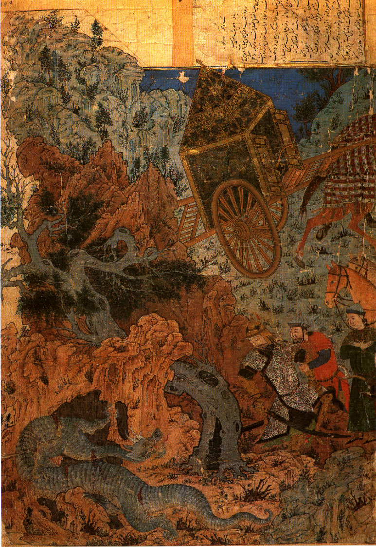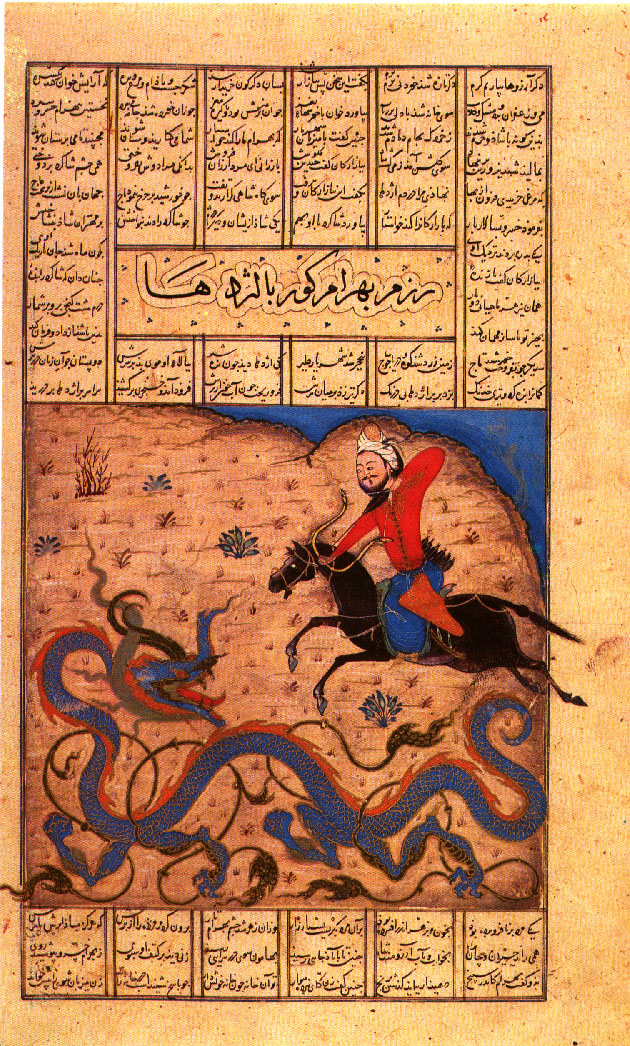 Бахрам Гур в борьбе с Драконом Шах-наме. Шираз, 1370. Hazine 1151, фолио 206B |