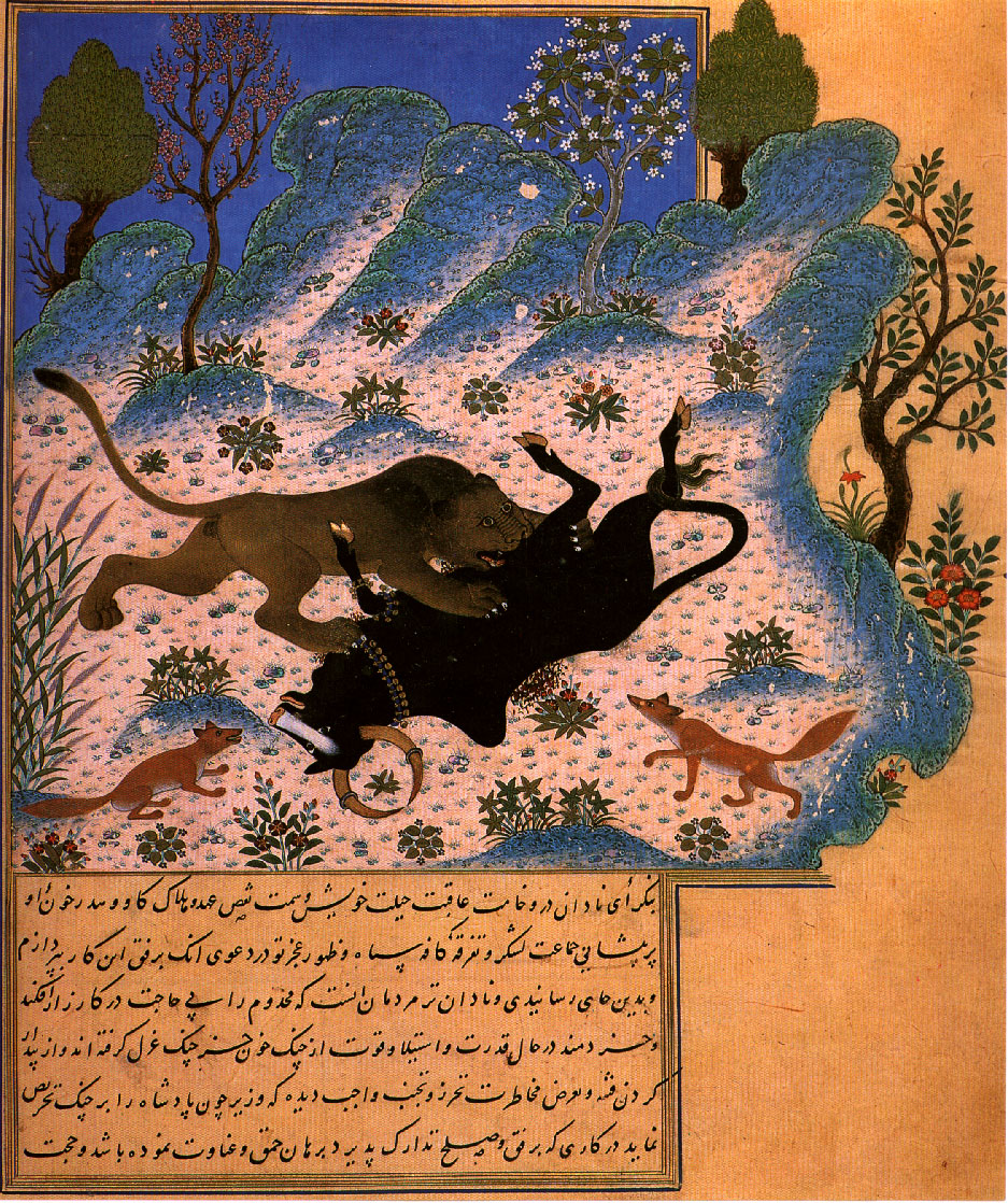 Лев атакующий быка Калила ва Димна. Герат, 1430. Revan 1022, фолио 46b |