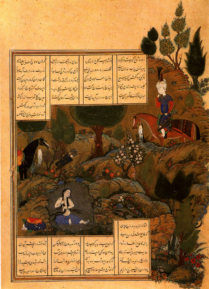 Хосров встетил Ширин во время купания Хамса. Тебриз, 1481. Hazine 762, фолио 38b |