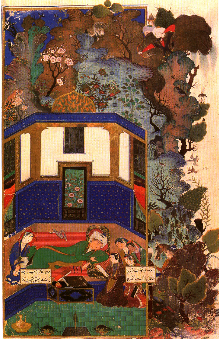 Бахрам Гур в Зеленом павильоне Хамса. Тебриз, 1481. Hazine 762, фолио 180B |