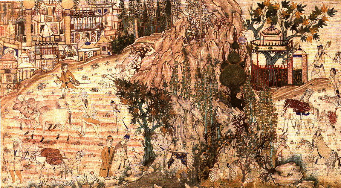 Работники в поле перед городом. Page from the Sarai Albums. Исфахан, конец 16 века. Hazine 2166, лист 27а |