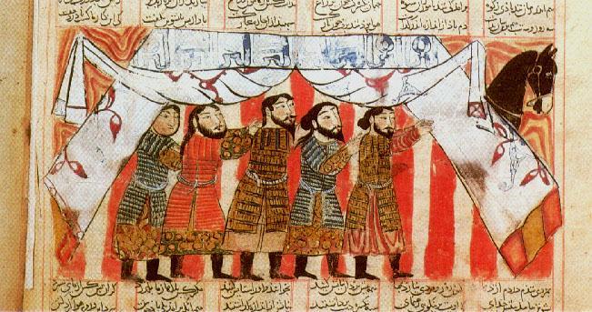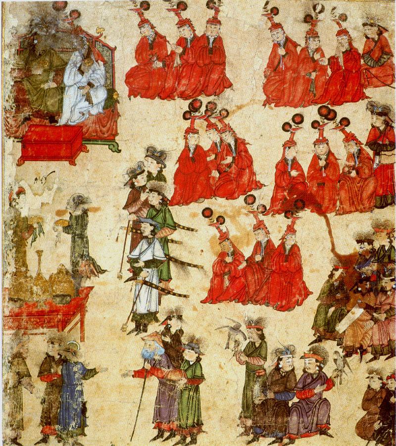 Монгольский правитель с супругой восходит на престол. Одна из немногих миниатюр где изображены 100% монголы. Джами 'аль-Таварик ("Всеобщая история" Рашида аль-дин). Ил-Ханид Тебриз, 1330. Hazine 1653, фолио 23а |