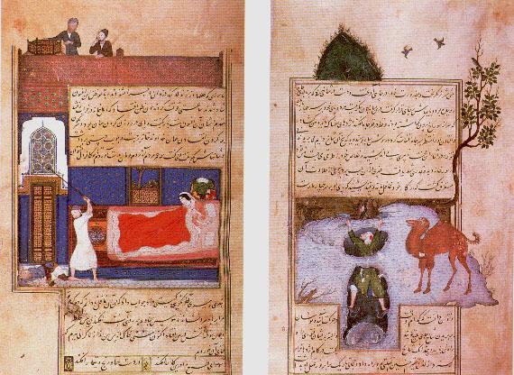 Слева: вор обнаружил в кровати камеры, справа: опасность для жизни Калила ва Димна. Герат, 1430. Hazine 362, лист 24а, 27б |